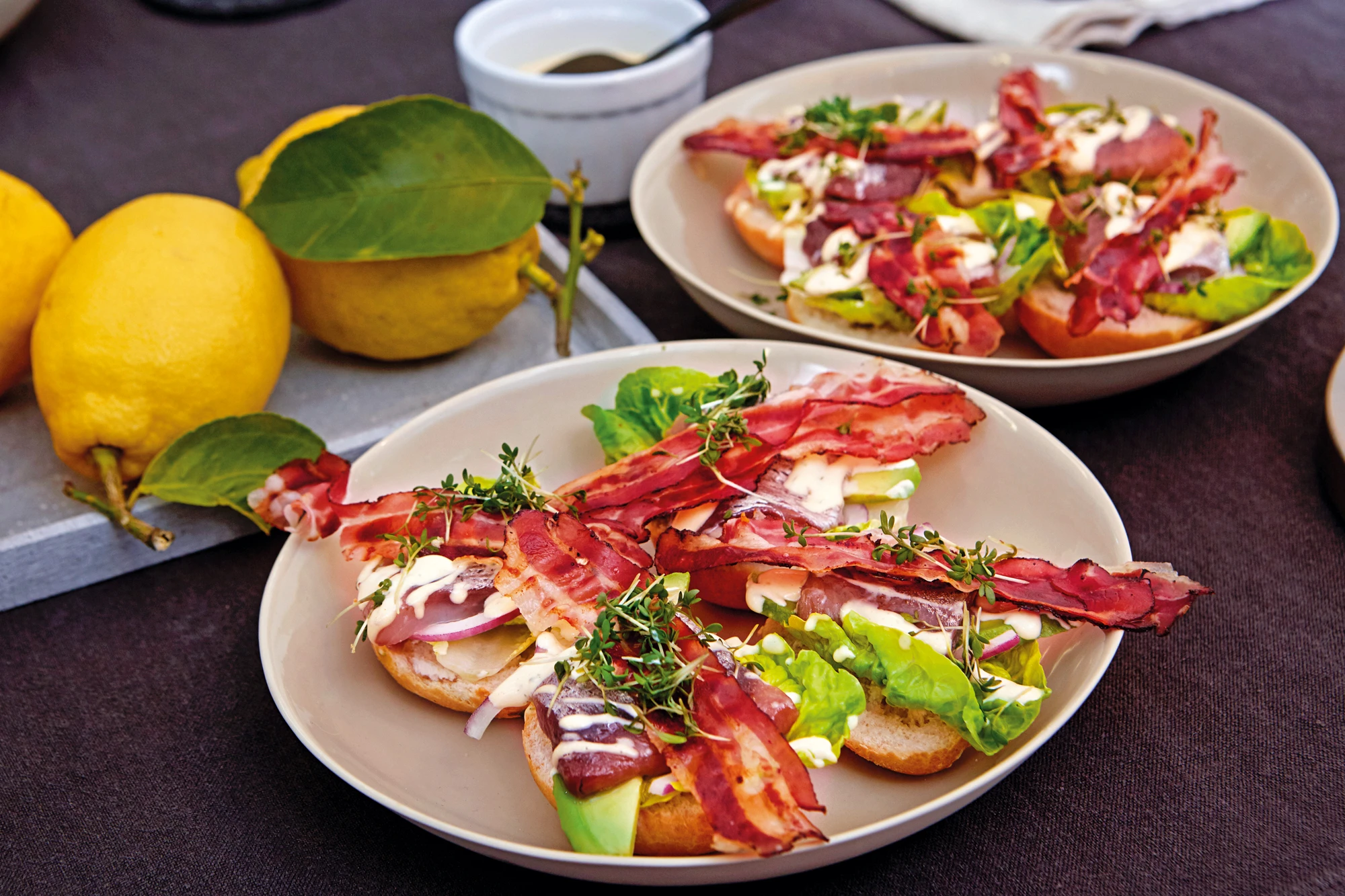 Matjesfilets trockentupfen und quer vierteln. Salat putzen, längs halbieren und zerpflücken. Zwiebel schälen und in Ringe schneiden. Avocado schälen, halbieren und den Kern entfernen. Fruchtfleisch quer in Scheiben schneiden und mit Zitronensaft vermischen. Kresseblättchen abschneiden. Speck in einer beschichteten Pfanne ohne Zugabe von Öl beidseitig braten und auf Küchenpapier abtropfen lassen. Semmerl durchschneiden. Hälften mit Salat, Avocado, Zwiebeln und Matjes belegen. Mit Sauce beträufeln, mit Speck belegen und mit Kresse bestreuen.