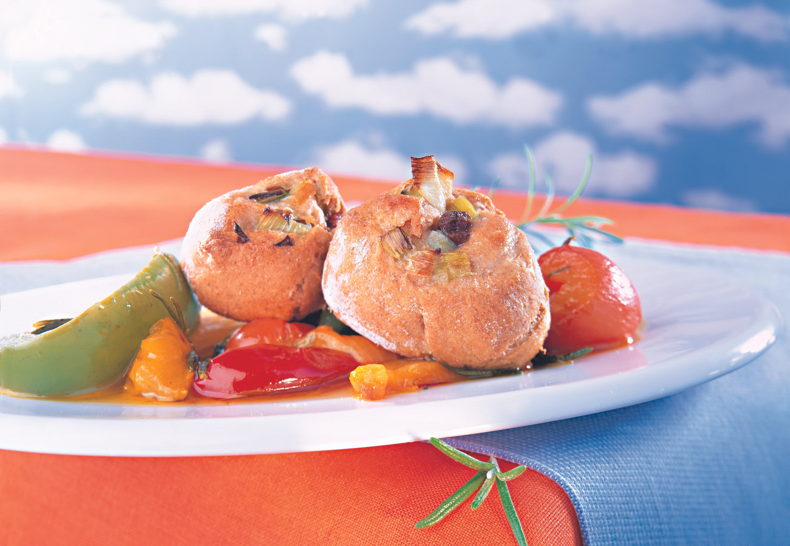 Jungzwiebel-Dinkelschnecken auf Paprikagemüse