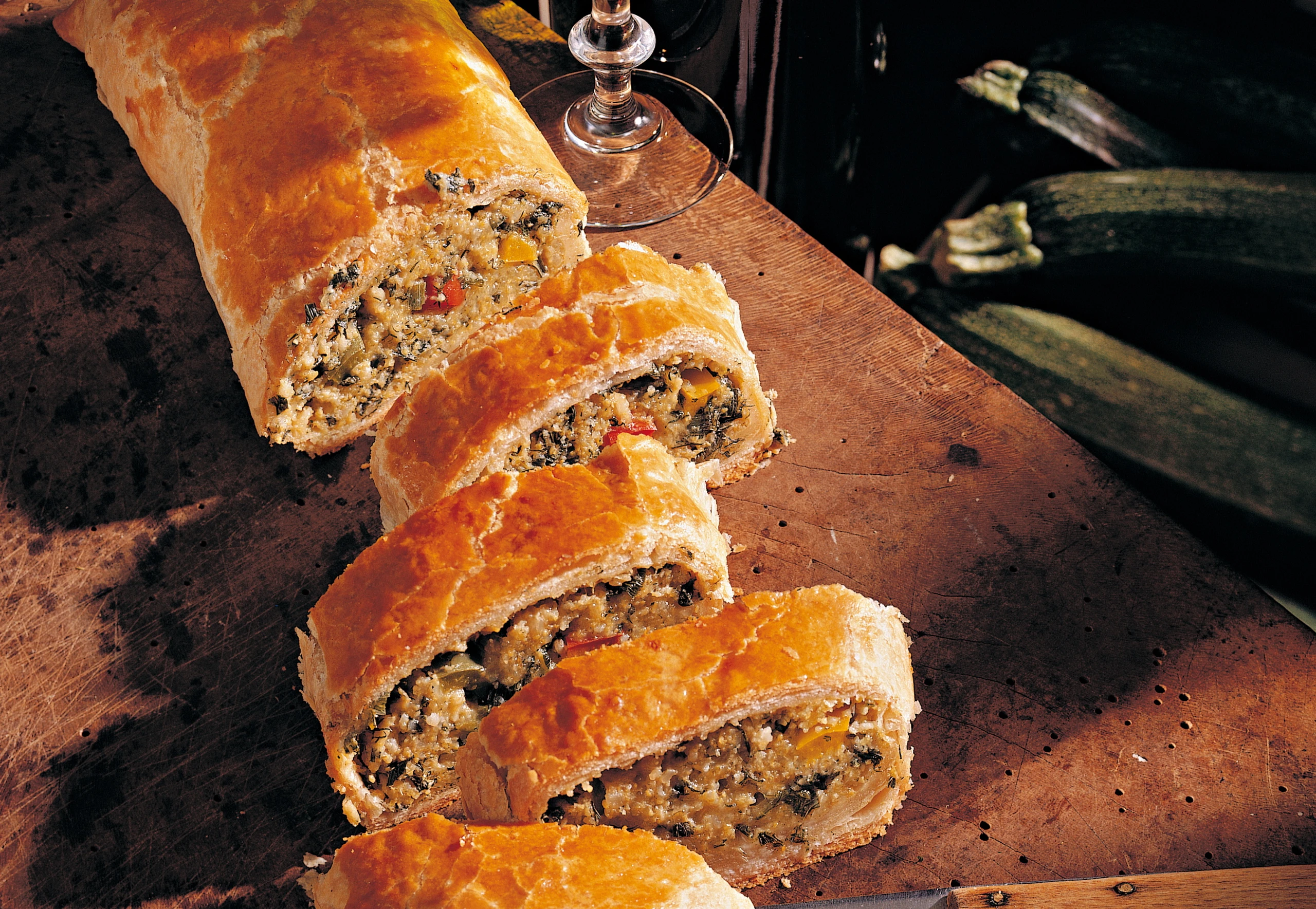 Teig über die Fülle einrollen. Strudel auf das Backblech setzen, mit verquirltem Ei bestreichen und mehrmals mit einer Gabel einstechen. Strudel im vorgeheizten Rohr (mittlere Schiene) ca. 1/2 Stunde goldgelb backen (jetzt Sauce zubereiten!). Als Beilage serviert man Blattsalate.