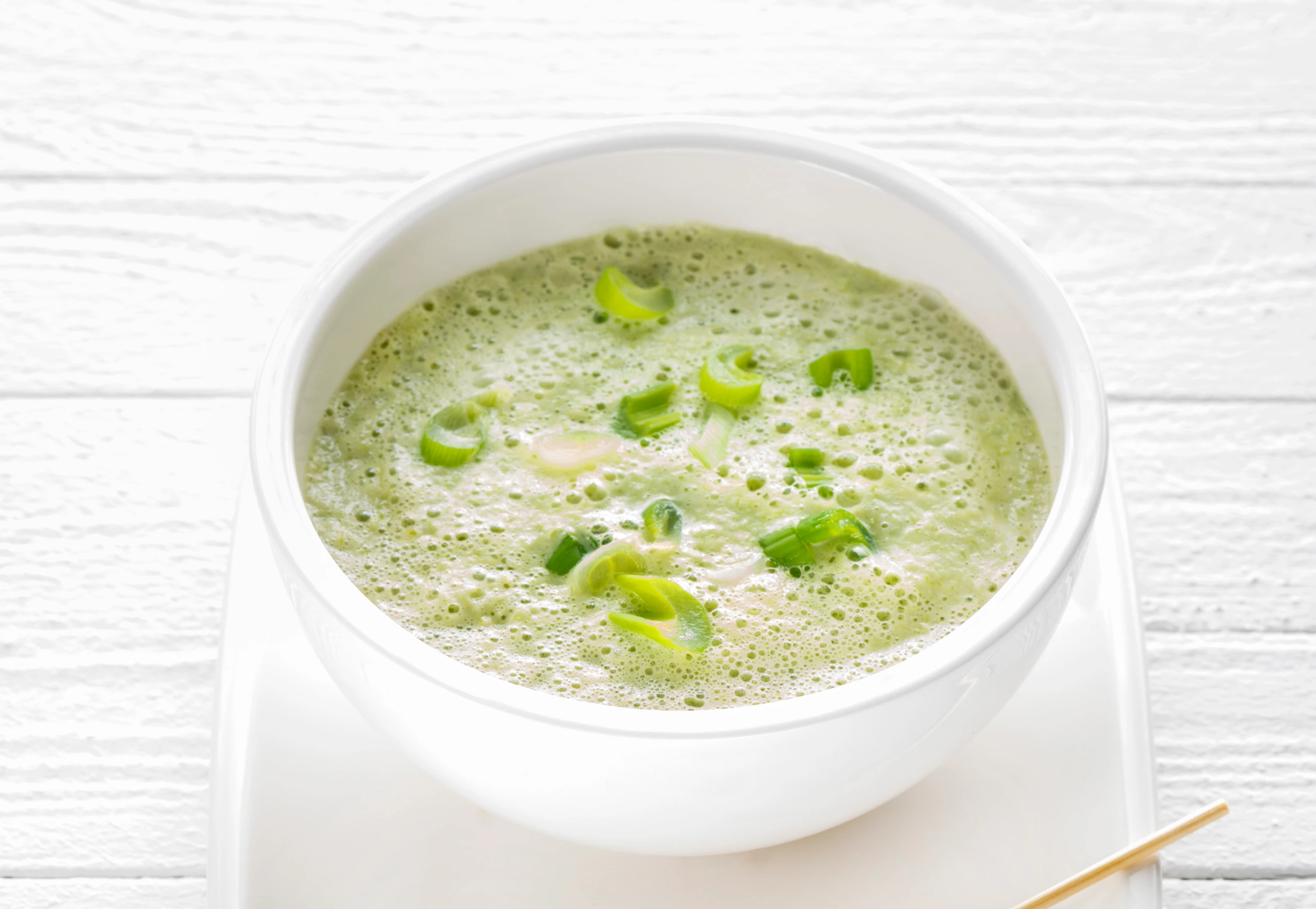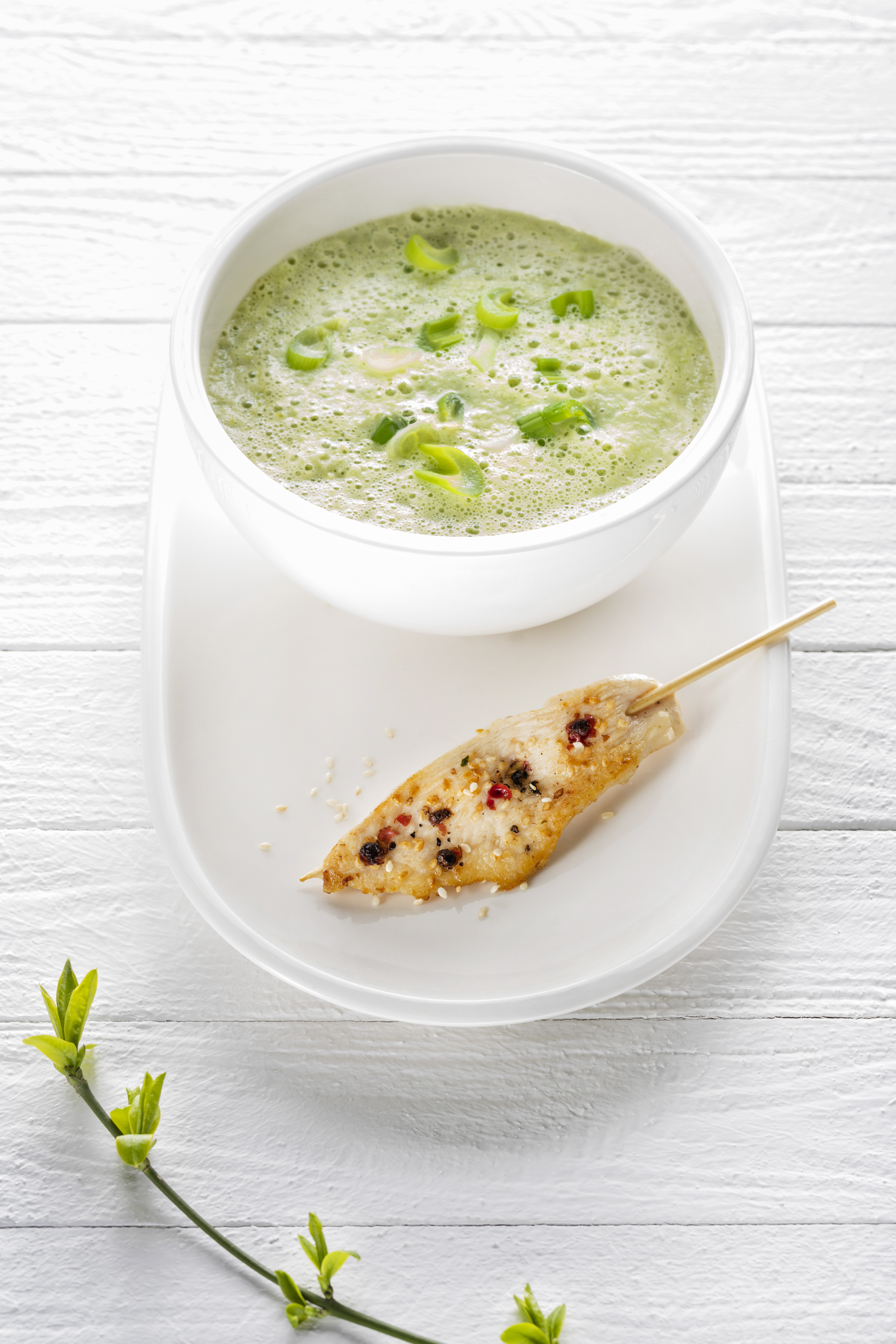 Suppe anrichten und mit reservierten Jungzwiebeln und Hühnerspießchen servieren.