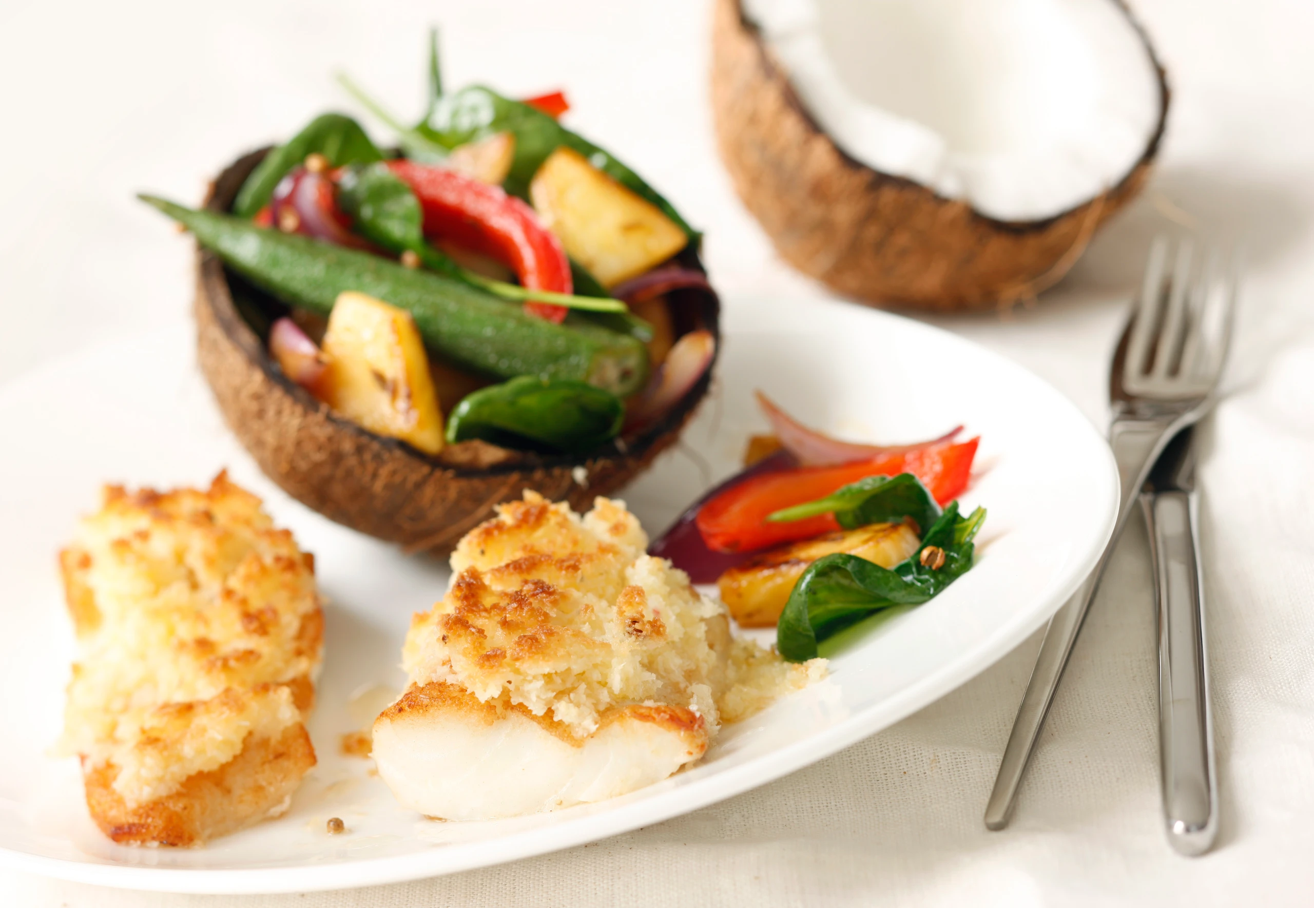 - In einer Pfanne übriges Kokosfett erhitzen. Kabeljaufilets salzen und darin beidseitig anbraten. Filets in die Form legen, Kokosmasse darauf verteilen. Filets im Rohr (mittlere Schiene / Gitterrost) goldbraun überbacken. Aus dem Rohr nehmen und mit dem Salat anrichten.