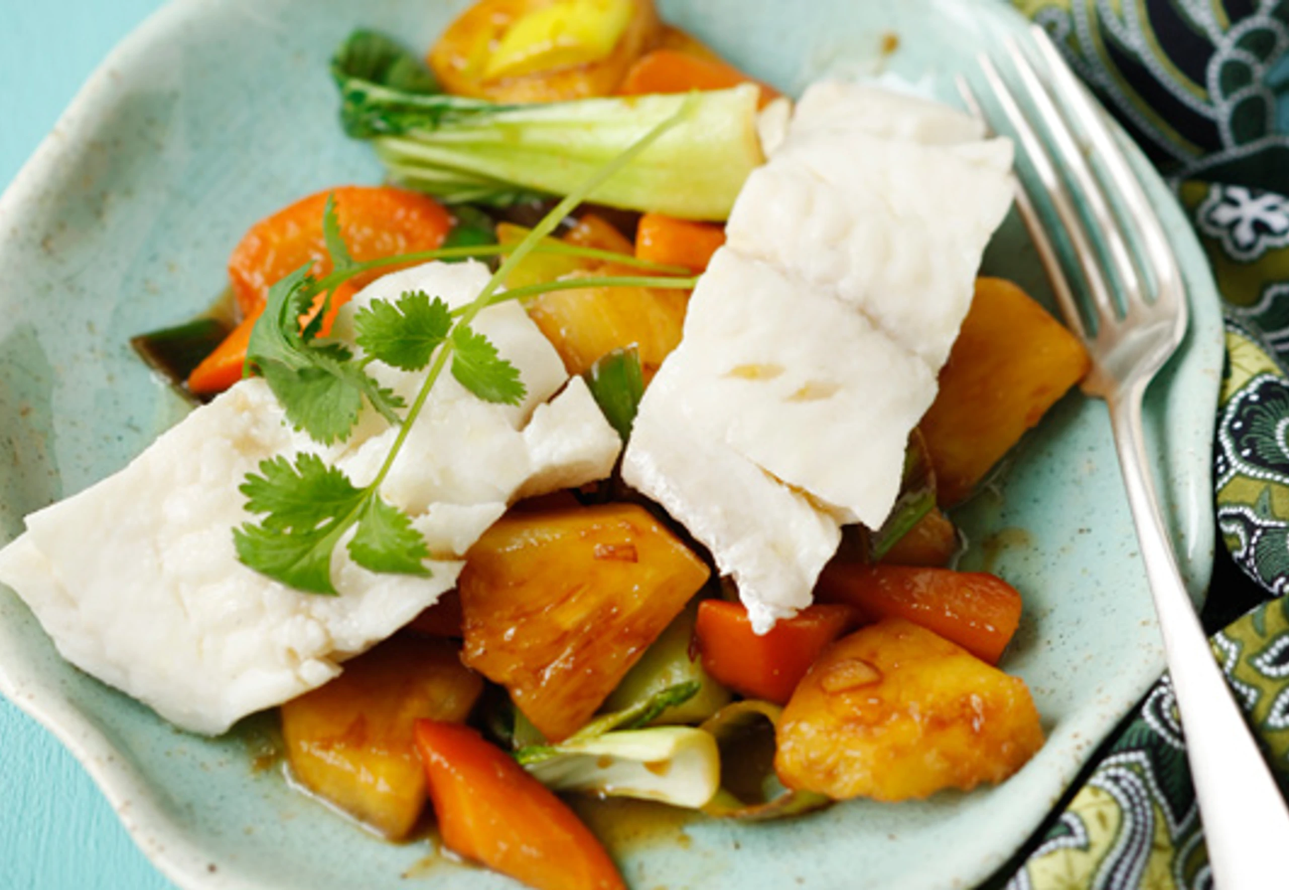 - Filets mit dem Gemüse anrichten, mit wenig Fond beträufeln und mit Koriander garniert servieren.