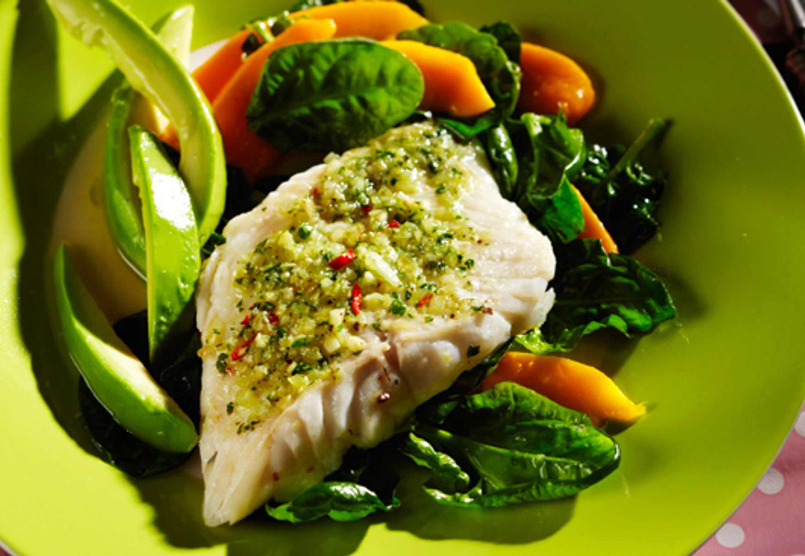 - Spinat waschen, nass mit wenig Salz in einen Topf geben, zugedeckt bei schwacher Hitze zusammenfallen lassen. Spinat, Mangos, Fisch und Avocado anrichten.