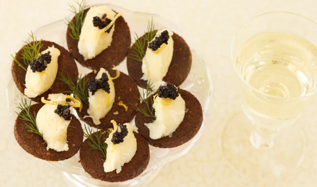 - Aus der Creme Nockerln ausstechen, auf die Pumpernickelscheiben setzen, mit Dille, restlicher Zitronenschale und Kaviar garnieren.