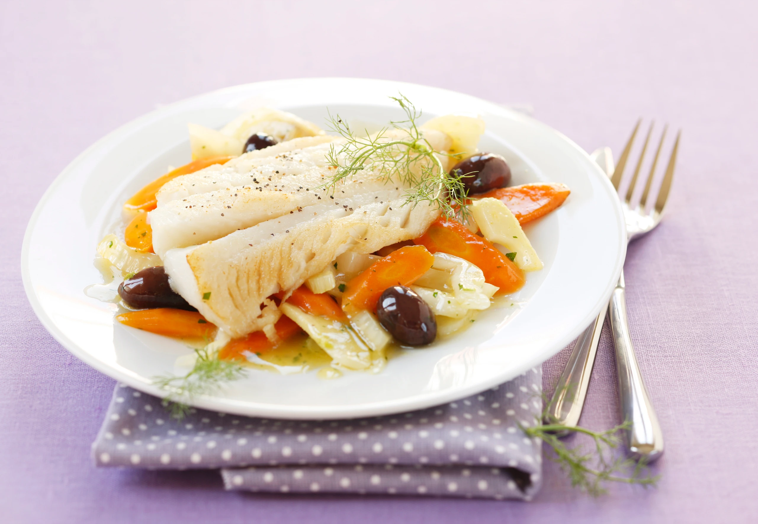 - Stärke mit 2 EL Wasser vermischen, in das Gemüse rühren und kurz mitköcheln. Fenchelgrün und Petersilie untermischen. Kabeljau mit dem Gemüse anrichten.