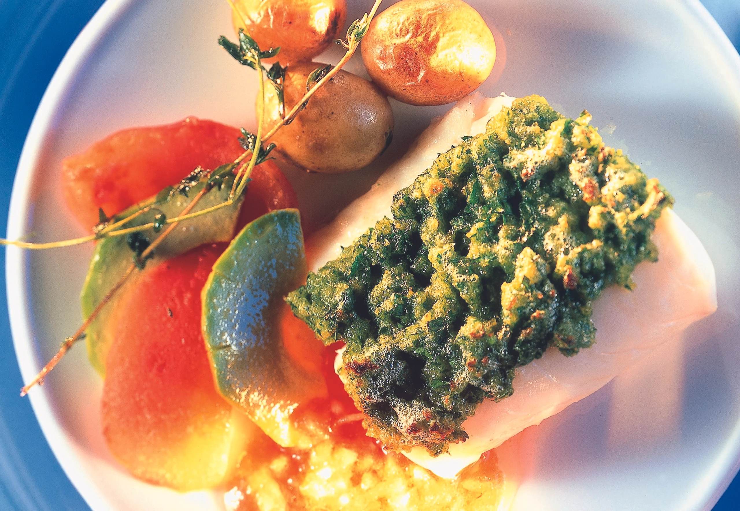 Kabeljaufilet mit Kräuterkruste und Paradeis-Vinaigrette