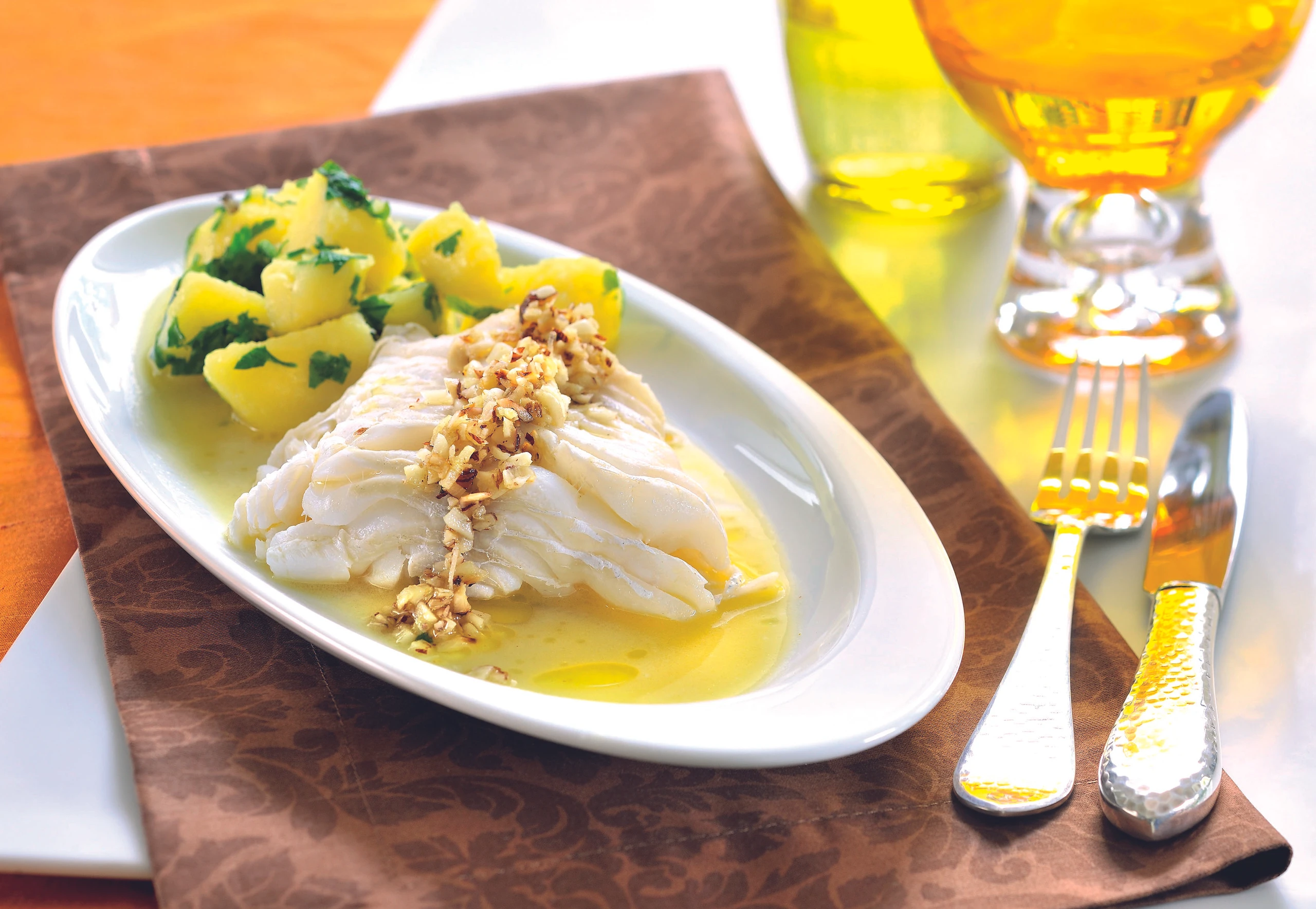- Erdäpfel schälen und in Stücke schneiden. Butter aufschäumen, Erdäpfel und Petersilie zugeben, salzen und vermischen. Fischfilets mit dem entstandenen Fond, der Nussbutter und den Erdäpfeln anrichten.