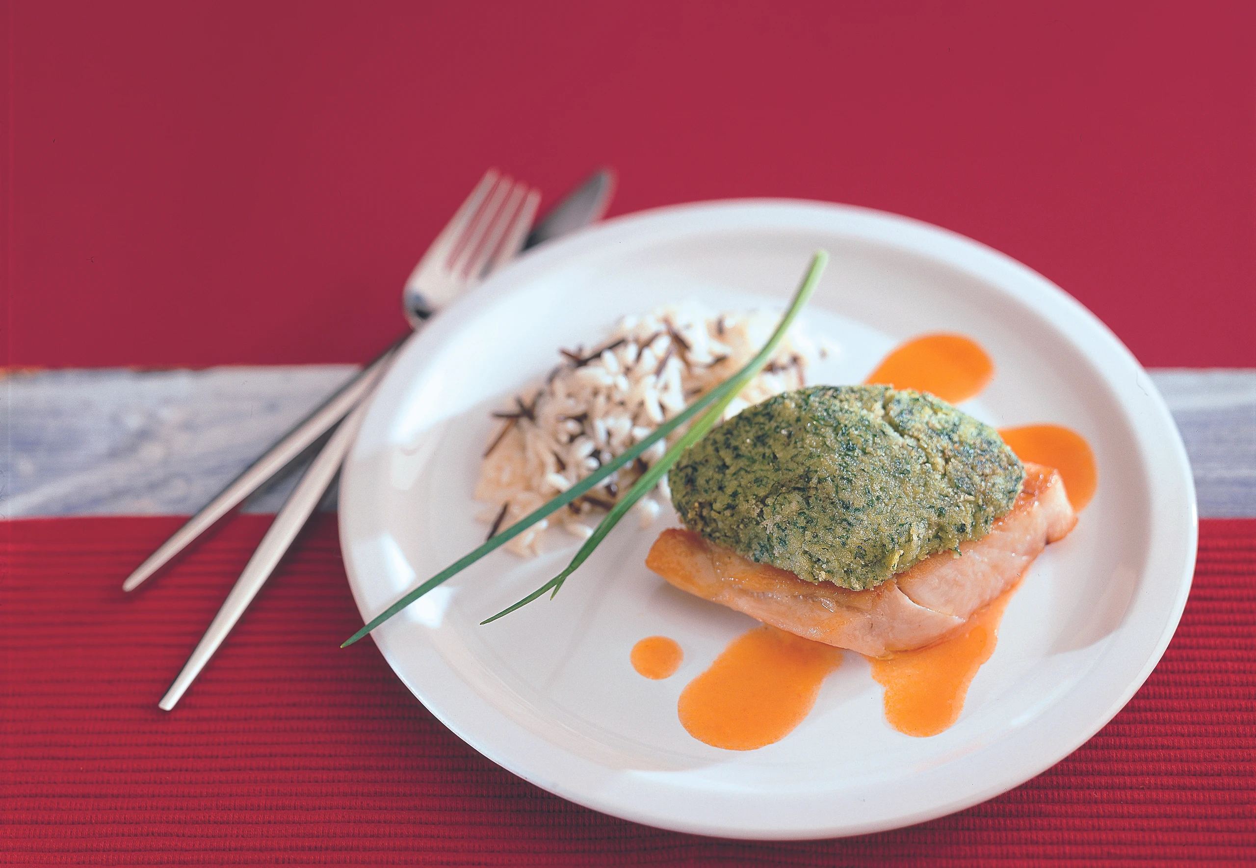 Fischfilets im Rohr (mittlere Schiene / Gitterrost) 2–3 Minuten überbacken und mit der Sauce anrichten. Als Beilage passt gemischter Reis (Langkorn- und Wildreis).