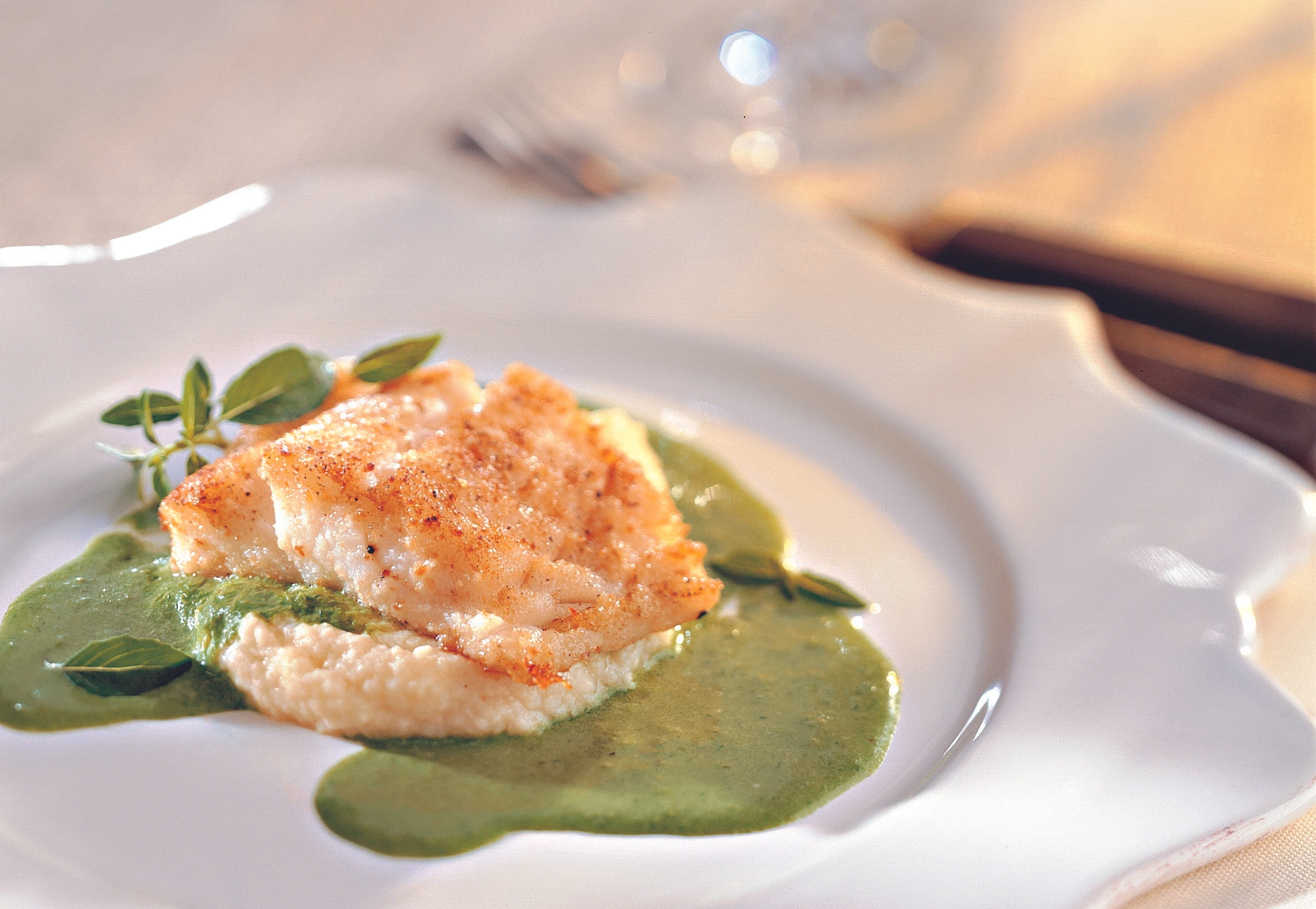 Selleriepüree anrichten, Fischfilets darauf legen und mit der Petersilsauce garniert servieren.