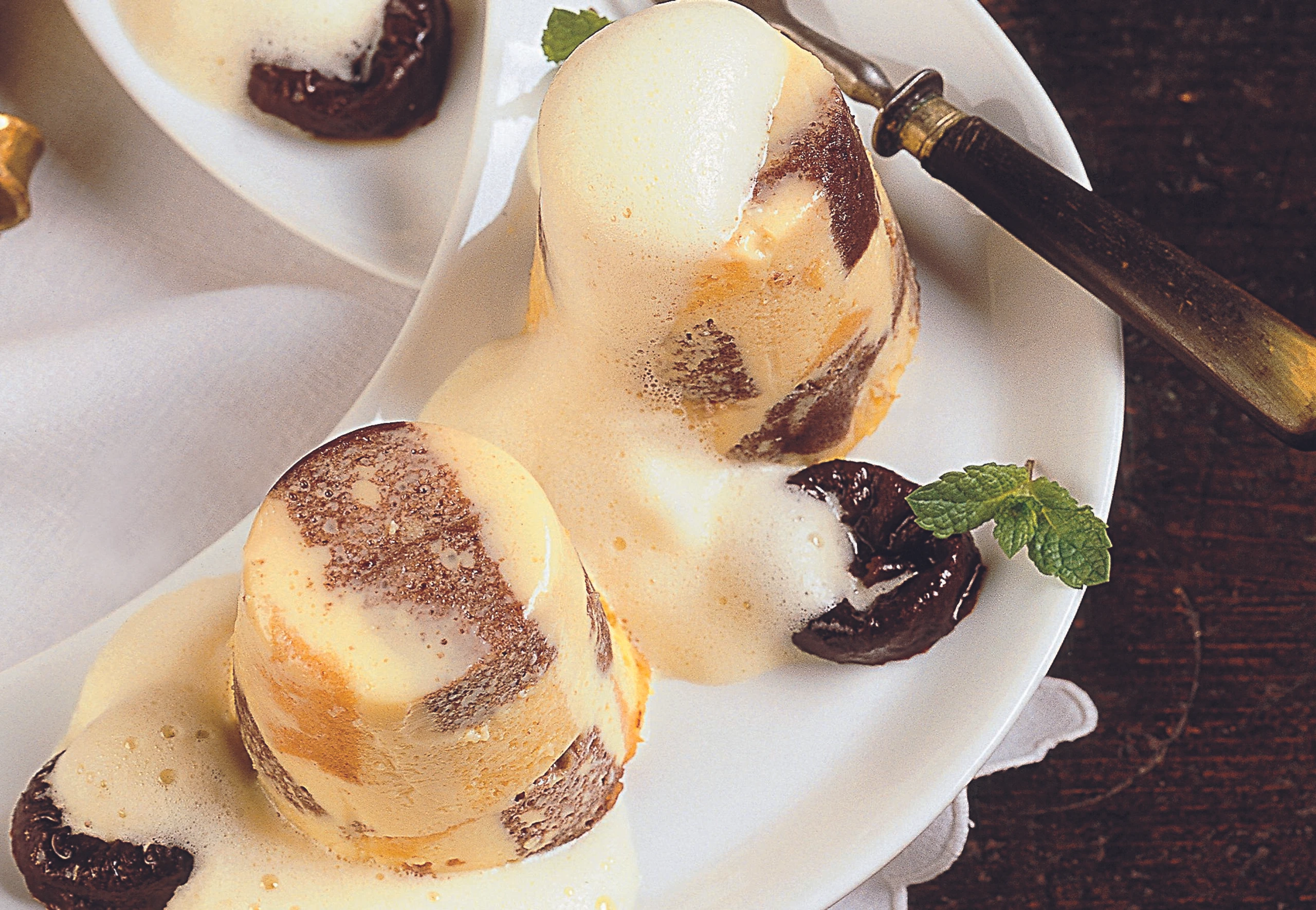 Puddings aus den Förmchen stürzen und mit Zwetschken, Wein-Schaum und Minze garniert servieren.