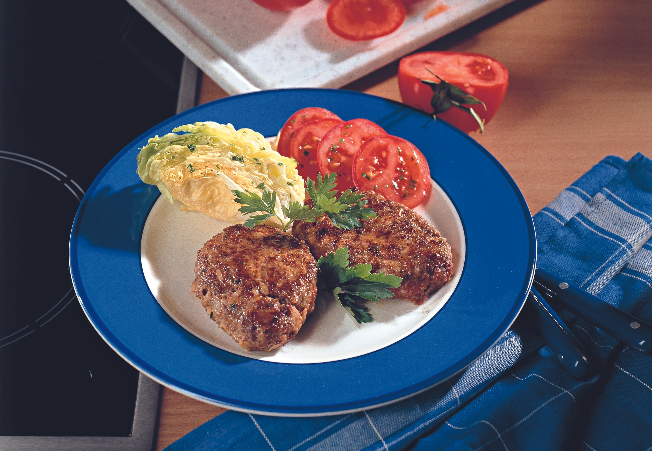 Inzwischen Zwiebel schälen, kleinwürfelig schneiden und in Butter anschwitzen, die Hälfte vom Faschierten zugeben und unter Rühren mitbraten. Faschiertes in eine Schüssel geben und auskühlen lassen. Rohes Faschiertes, Reis, Eier und Petersilie mit dem gebratenen Fleisch vermischen. Masse mit Salz, Pfeffer und Neugewürz abschmecken und zu 8 ovalen Laibchen formen. Fleischlaibchen in Mehl wenden, durch verquirltes Ei ziehen und in heißem Öl beidseitig goldbraun braten. Köfte mit grünem Salat und Paradeiserscheiben garniert servieren.