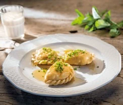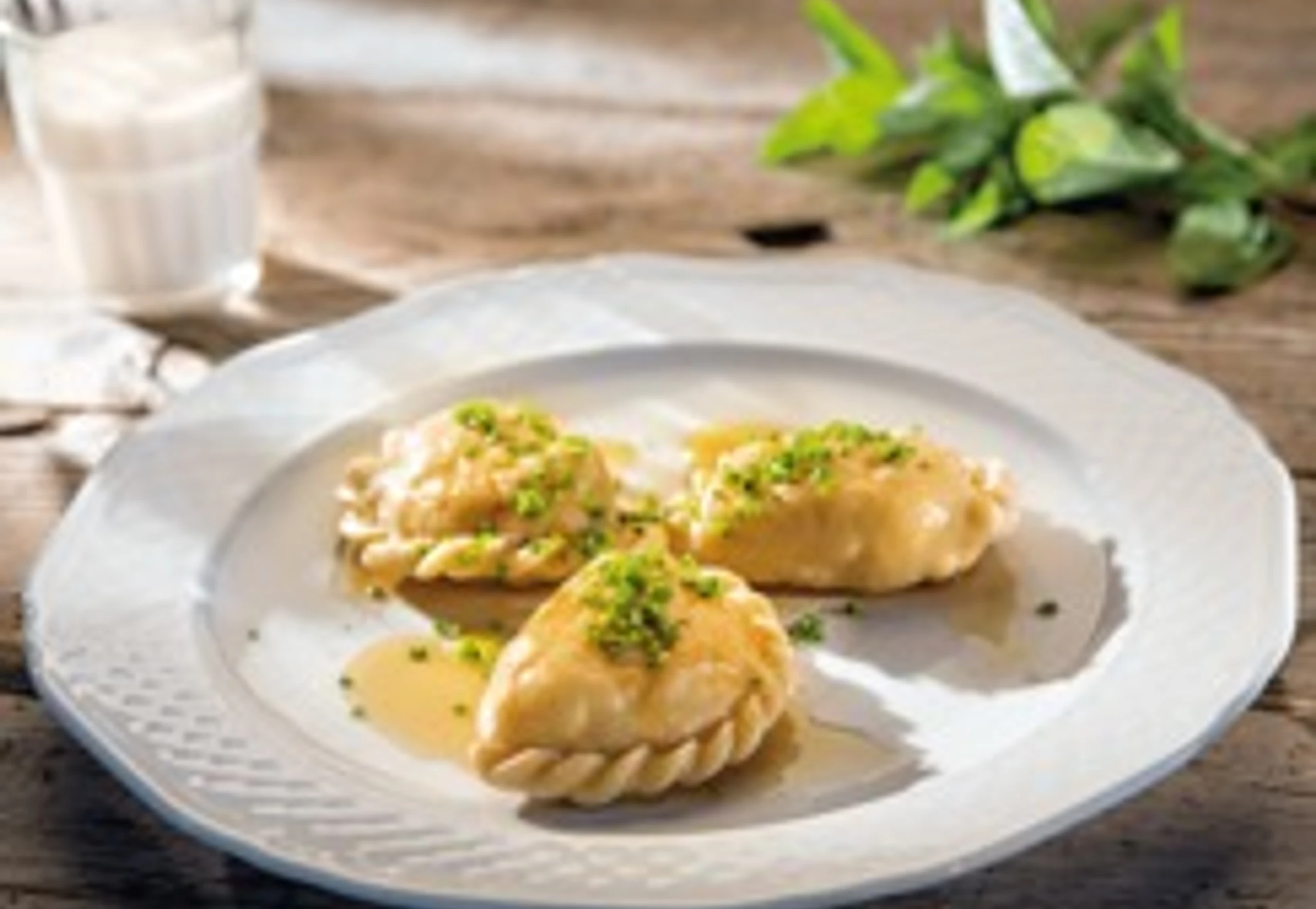 - Mehl, Wasser, Öl und 1 Prise Salz zu einem glatten Nudelteig verkneten. Teig auf einer leicht mit Mehl bestreuten Arbeitsfläche dünn ausrollen. Aus dem Teig Scheiben (Ø 7 cm) ausstechen. Auf jede Scheibe ein wenig außerhalb der Mitte 1 EL Fülle setzen. Unbelegte Teighälfte über die Fülle schlagen, an den Rändern gut zusammendrücken oder - original - "krendeln".