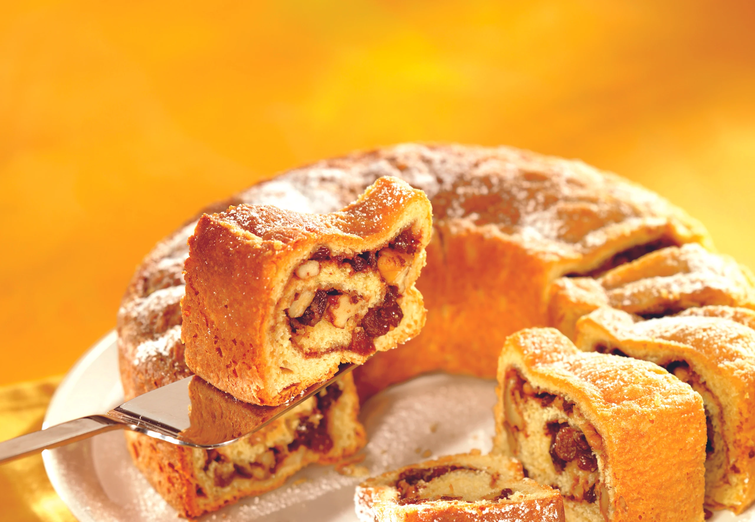 - Für die Fülle Rosinen mit Rum vermischen und ca. 90 Minuten ziehen lassen. Zucker mit Zimt vermischen. Kranzkuchenform (Ø 26 cm) mit Butter ausstreichen und mit Mehl ausstreuen.