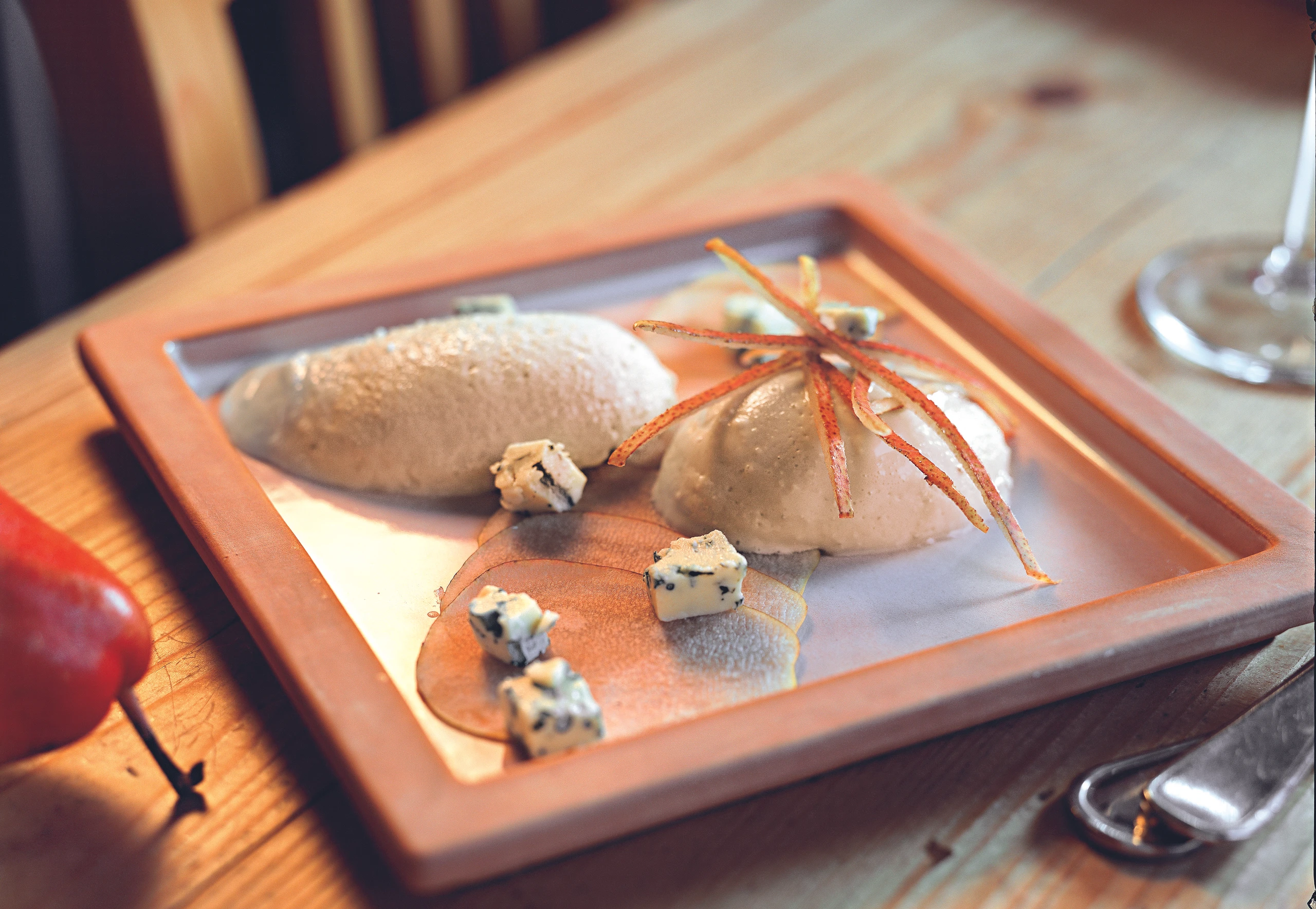 Birnen halbieren, Kerngehäuse ausstechen. Birnen in dünne Scheiben schneiden und auf Teller legen. Aus dem Mousse mit einem Löffel Nockerl ausstechen, auf die Birnen setzen und mit übrigem Käse bestreuen. Mousse eventuell mit Birnenstreifen garnieren.