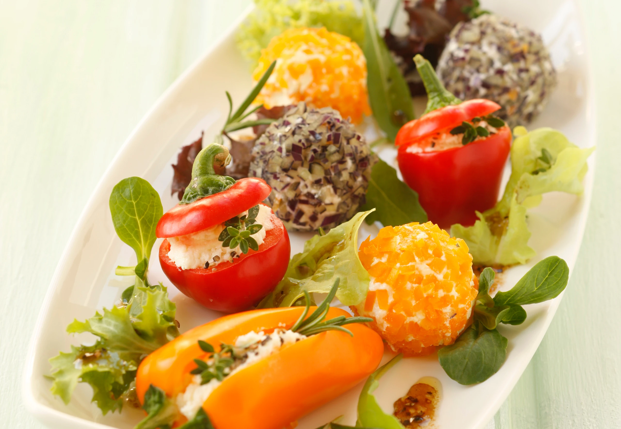 - Restlichen Käse zu kleinen Kugeln formen und diese in den gelben und violetten Paprikawürfeln wälzen.