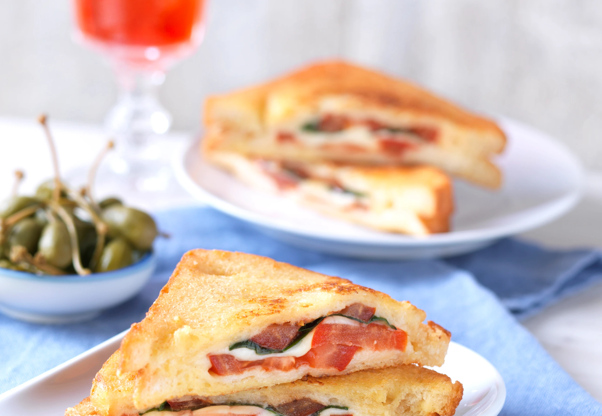Mozzarella abtropfen lassen. Mozzarella und Paradeiser in Scheiben schneiden. 3 Brote abwechselnd mit Paradeisern, Mozzarella und Basilikum belegen, salzen und pfeffern. Übrige Brote darauflegen, andrücken, mit Zahnstochern fixieren.