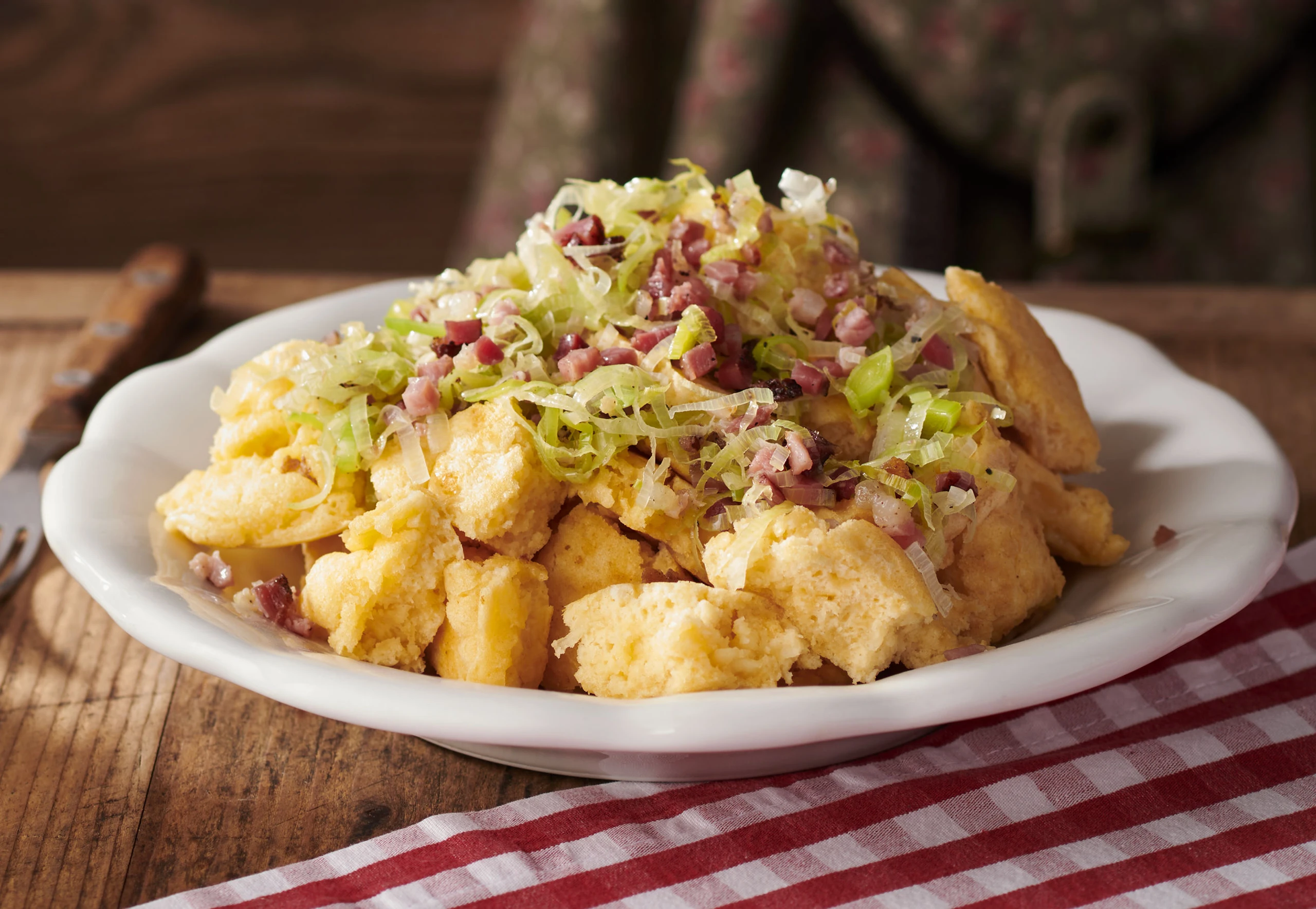 Käse-Schmarrn mit Lauch und Speck