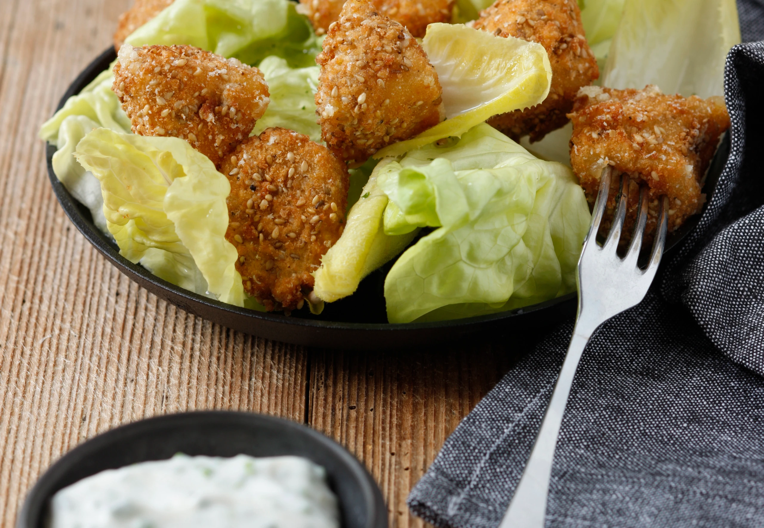 Brösel und Sesam vermischen. Emmentaler in ca. 3 cm große Stücke schneiden, mit Mehl bestreuen, durch die Eier ziehen und in der Bröselmischung wälzen; diesen Vorgang wiederholen.