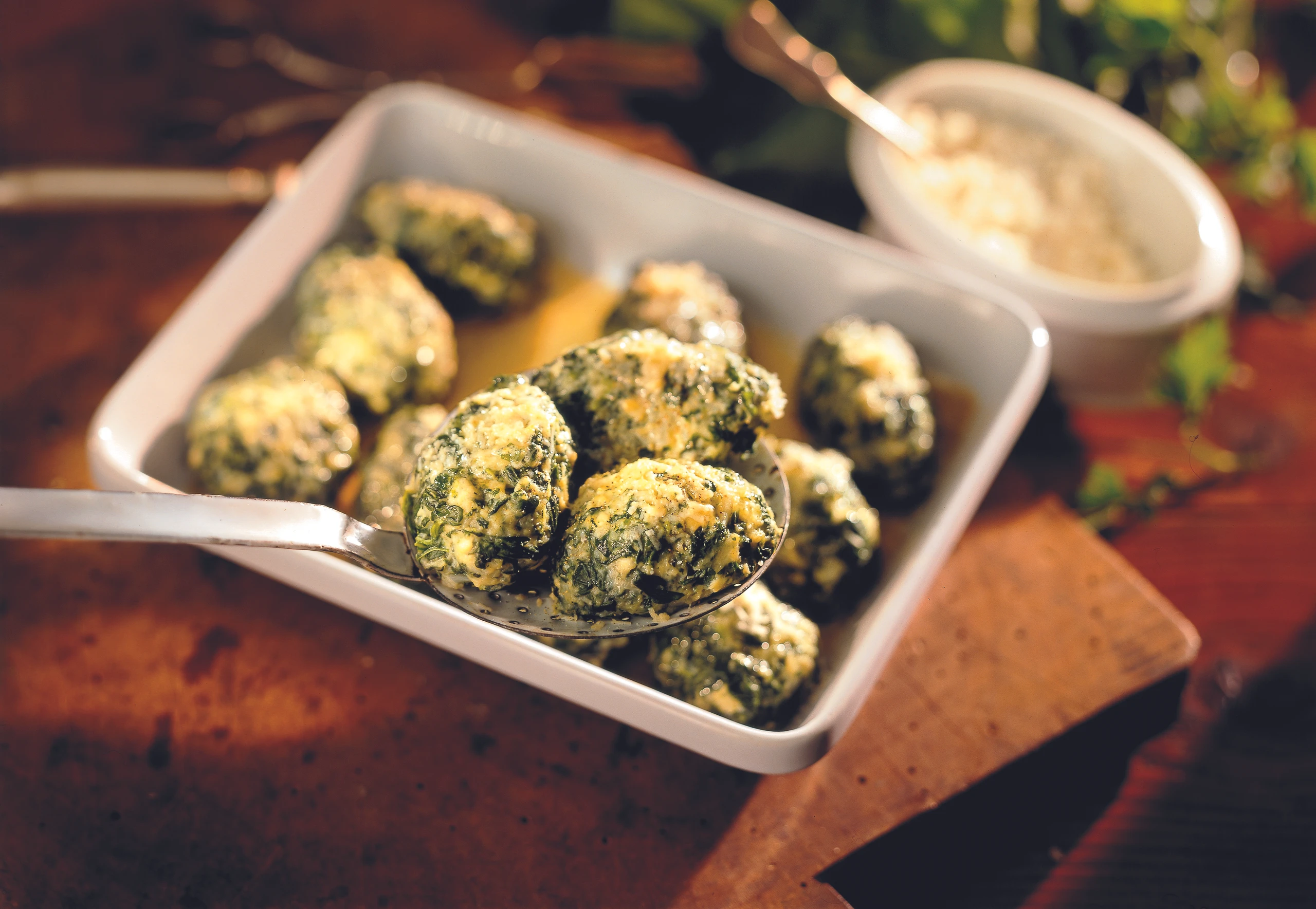 Mindestens 2 Liter Salzwasser aufkochen. Aus der Spinatmasse 12 Nockerl ausstechen und ins kochende Wasser legen. Hitze reduzieren und die Nockerl ca. 12 Minuten unter dem Siedepunkt gar ziehen lassen.