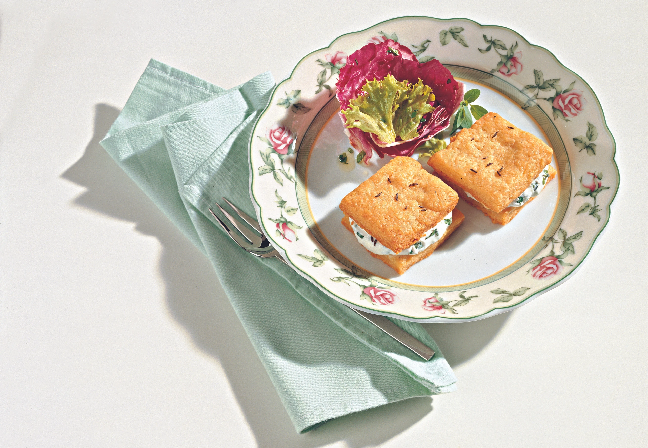 Je 2 Quadrate mit Kräutercreme zusammensetzen. Zusätzlich kann man diesen Käsegang mit marinierten Blattsalaten garnieren.
