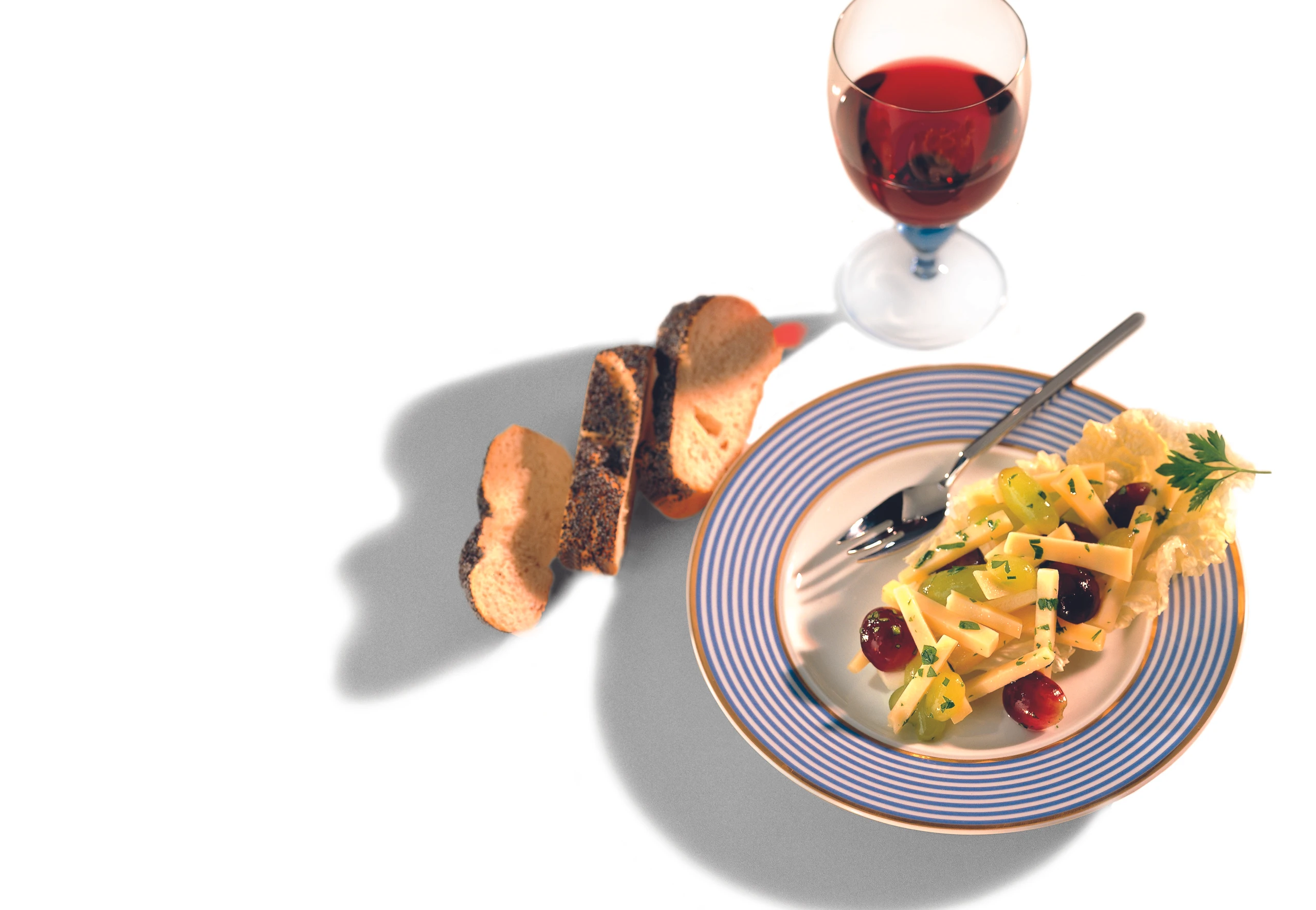 Trauben halbieren, eventuell vorhandene Kerne entfernen. Käse in ca. 1/2 cm dicke Stifte schneiden und mit den Trauben in eine Schüssel geben.