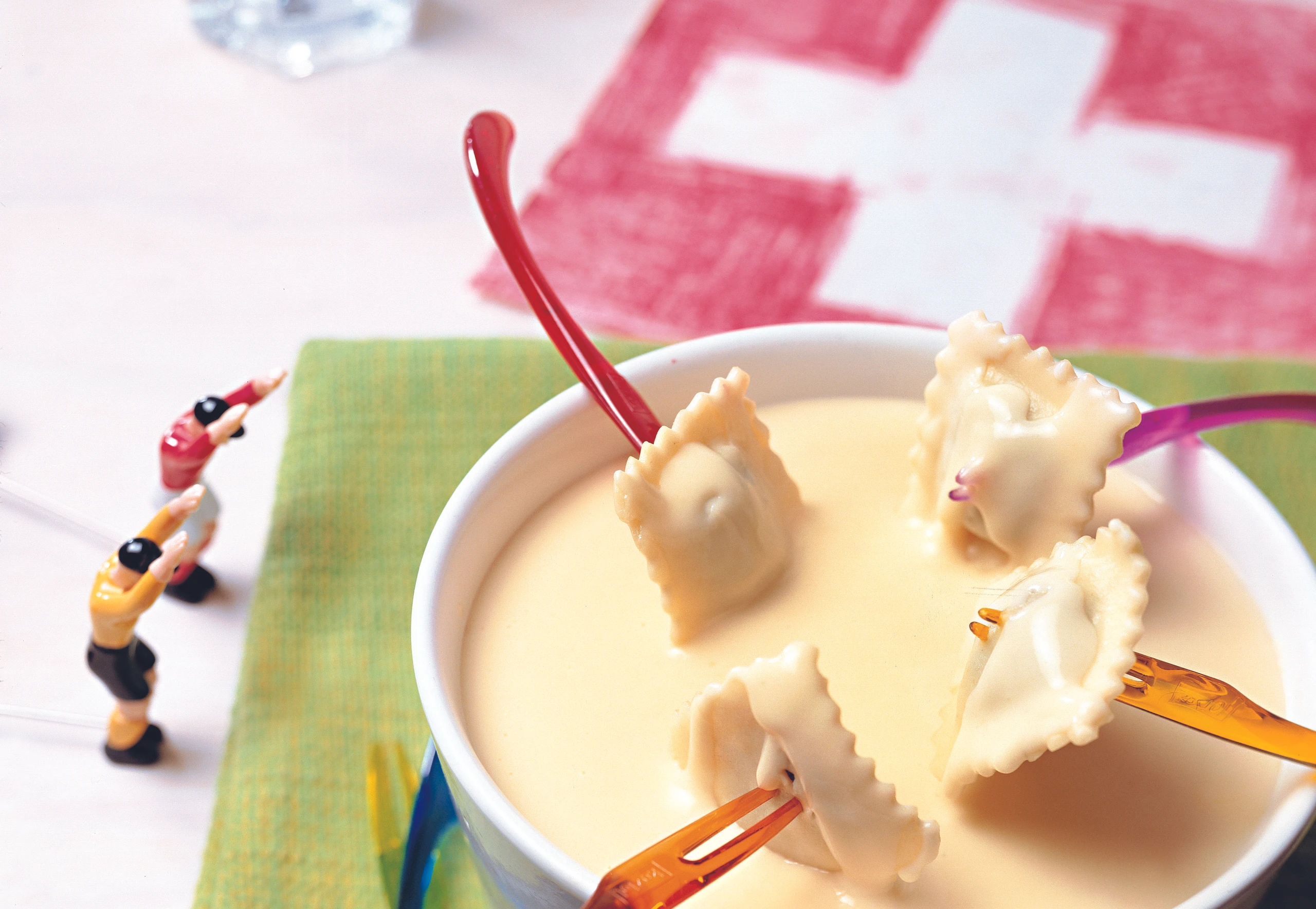 - Sobald die Käsemischung aufkocht, Maizena einrühren. Fondue nochmals kurz aufkochen. Mit Salz, Pfeffer und Muskat abschmecken. Ravioli nach Anleitung kochen und mit dem Fondue servieren.