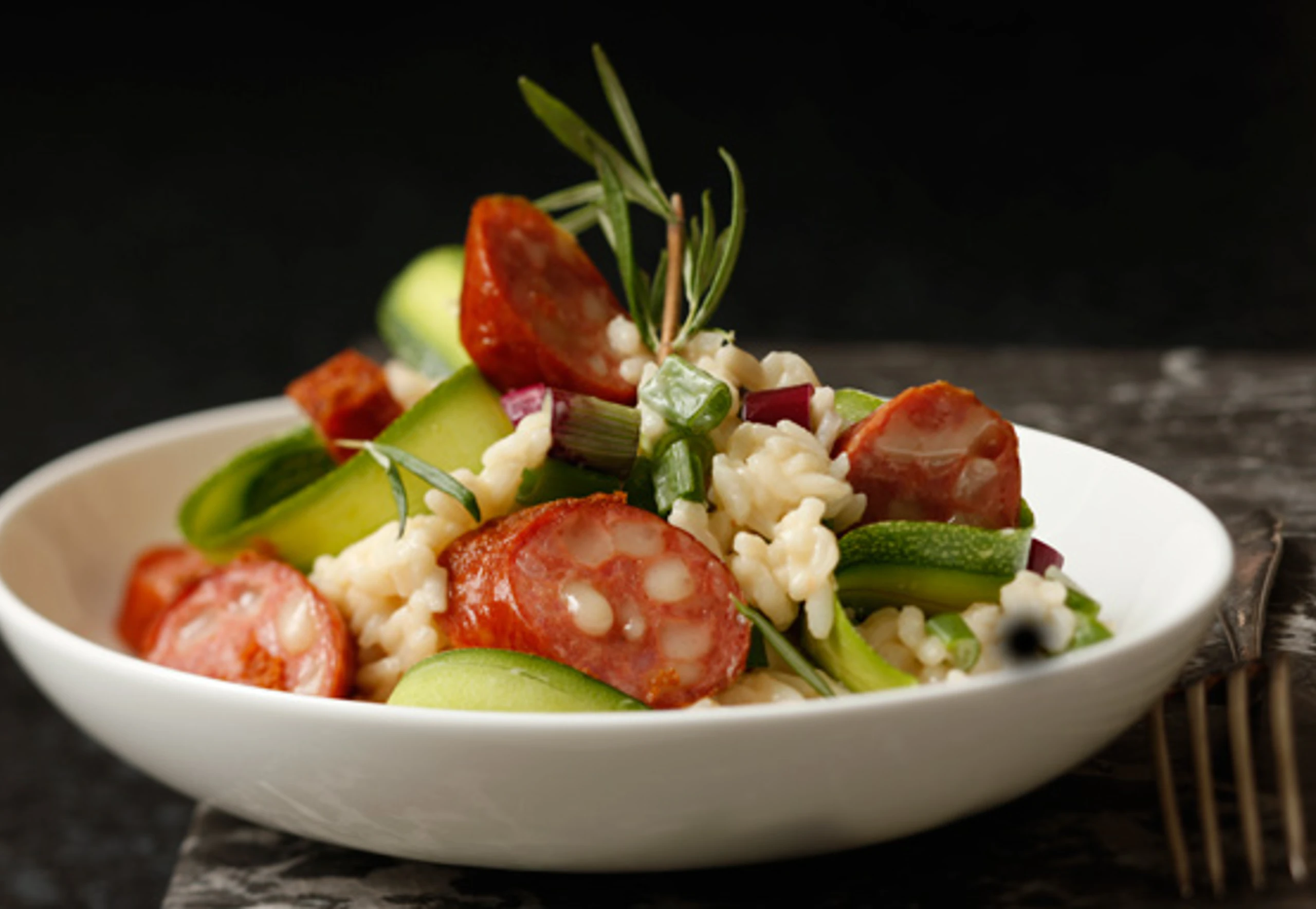 Nach halber Garzeit Jungzwiebeln, Zucchini, Petersilie und Rosmarin in das Risotto rühren und mitköcheln. 5 Minuten vor Ende der Garzeit Wurst zugeben. Risotto salzen, pfeffern, mit Parmesan verfeinern und mit Rosmarin garniert servieren.