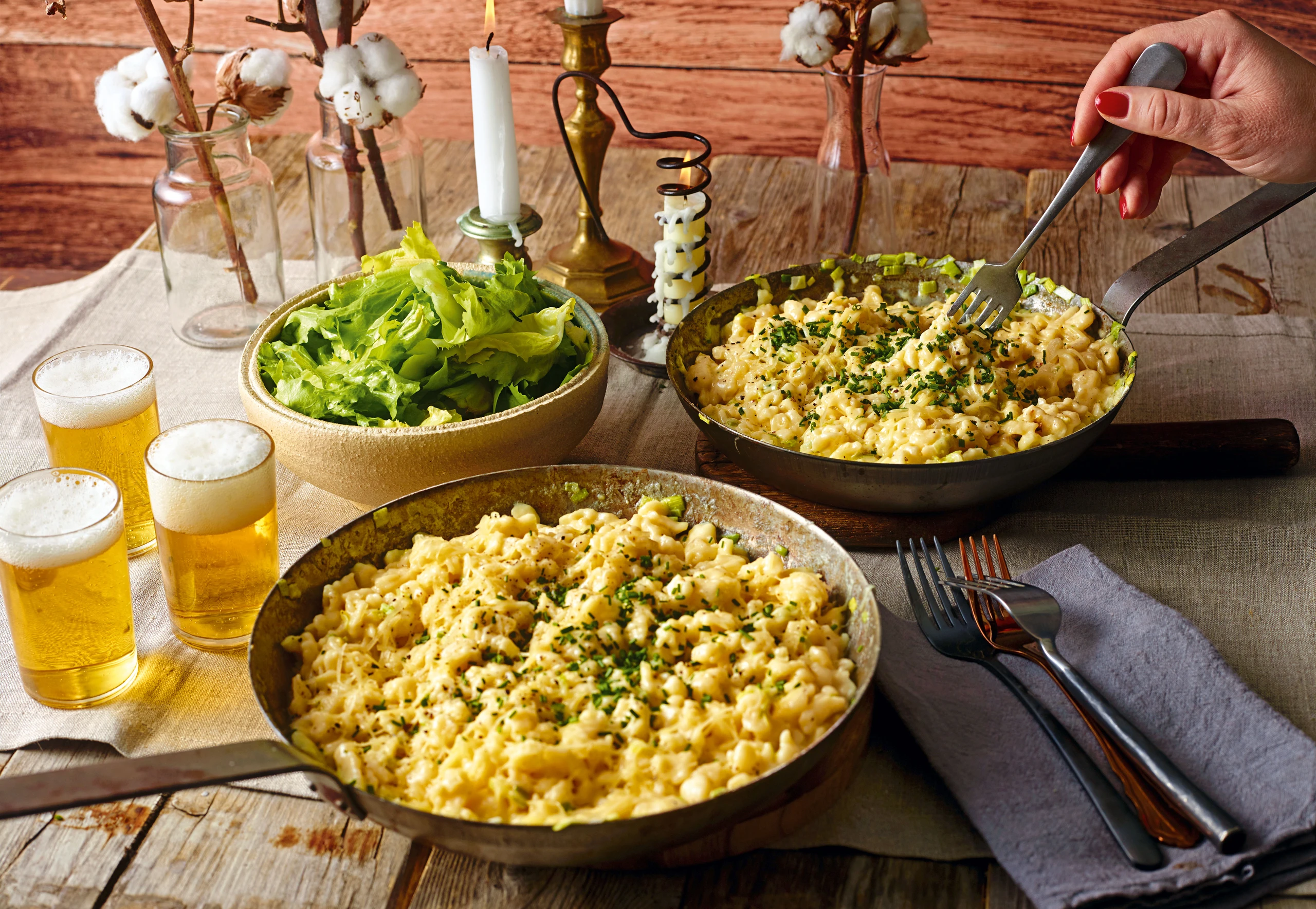 Nockerl aufteilen und unterrühren. Mischung bei schwacher Hitze köcheln, bis sich am Pfannenboden eine goldbraune Kruste gebildet hat. Schnittlauch schneiden. Salat marinieren.