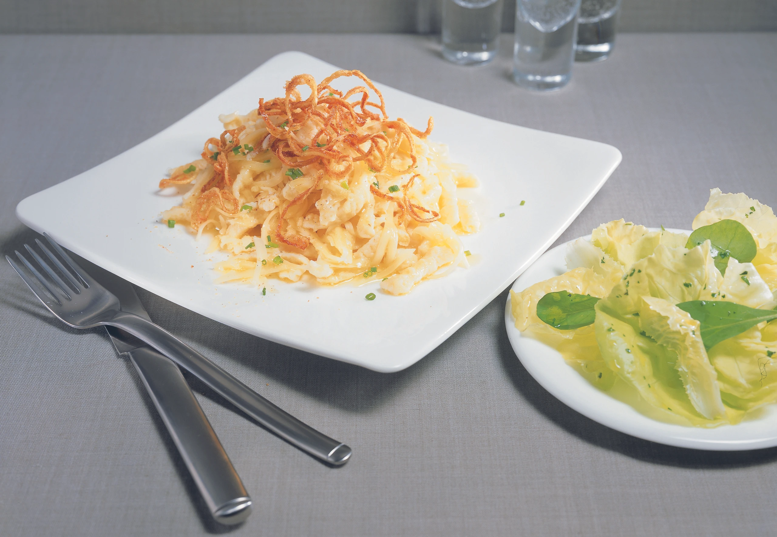 Spätzle lagenweise in eine Form oder Schüssel schichten, jede Lage mit Käse bestreuen – mit einer Schicht Spätzle abschließen. 1 Schöpfer Kochwasser darüber gießen, Röstzwiebel darüber streuen und mit Butter übergießen. Spätzle mit Schnittlauch bestreut servieren.