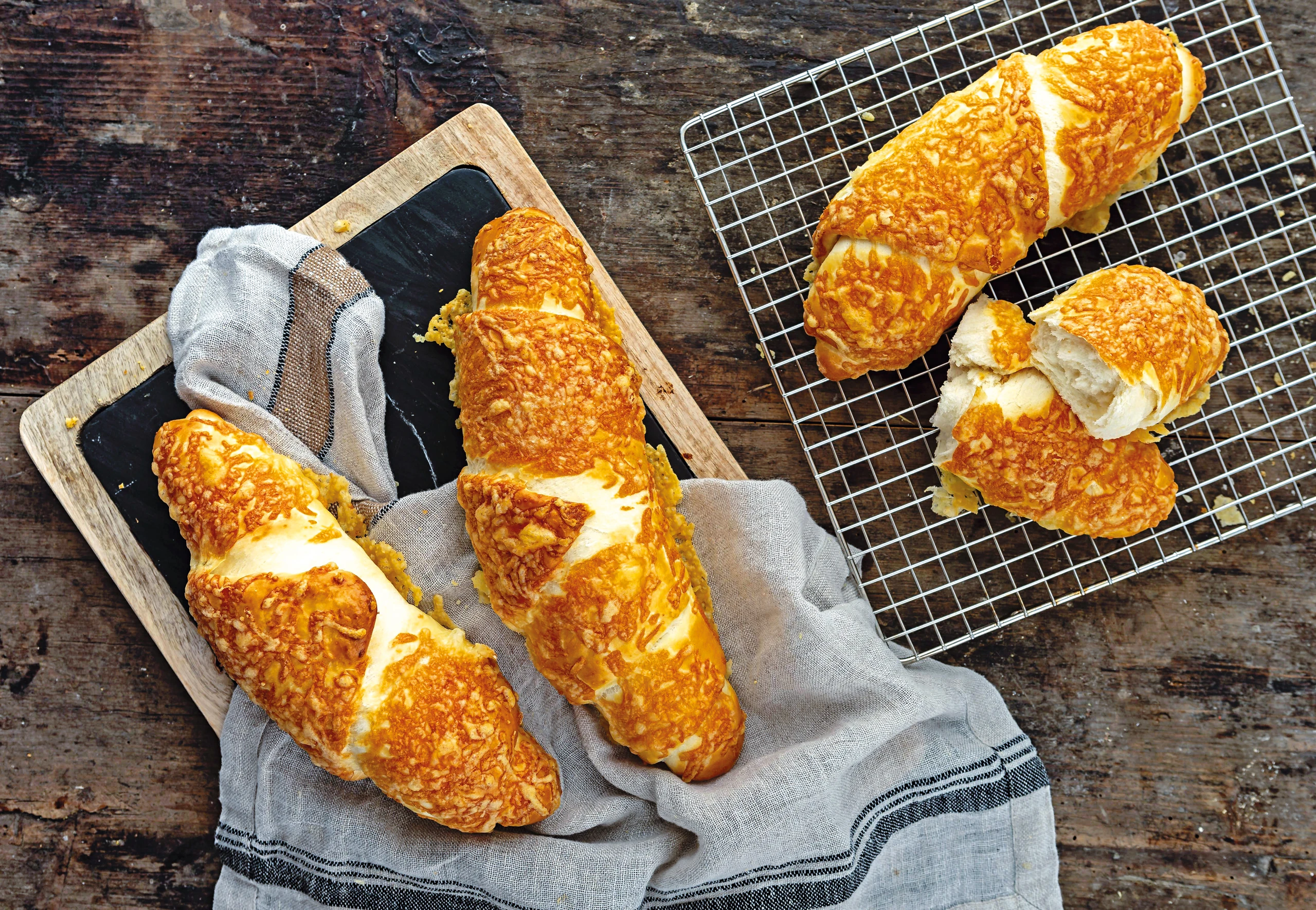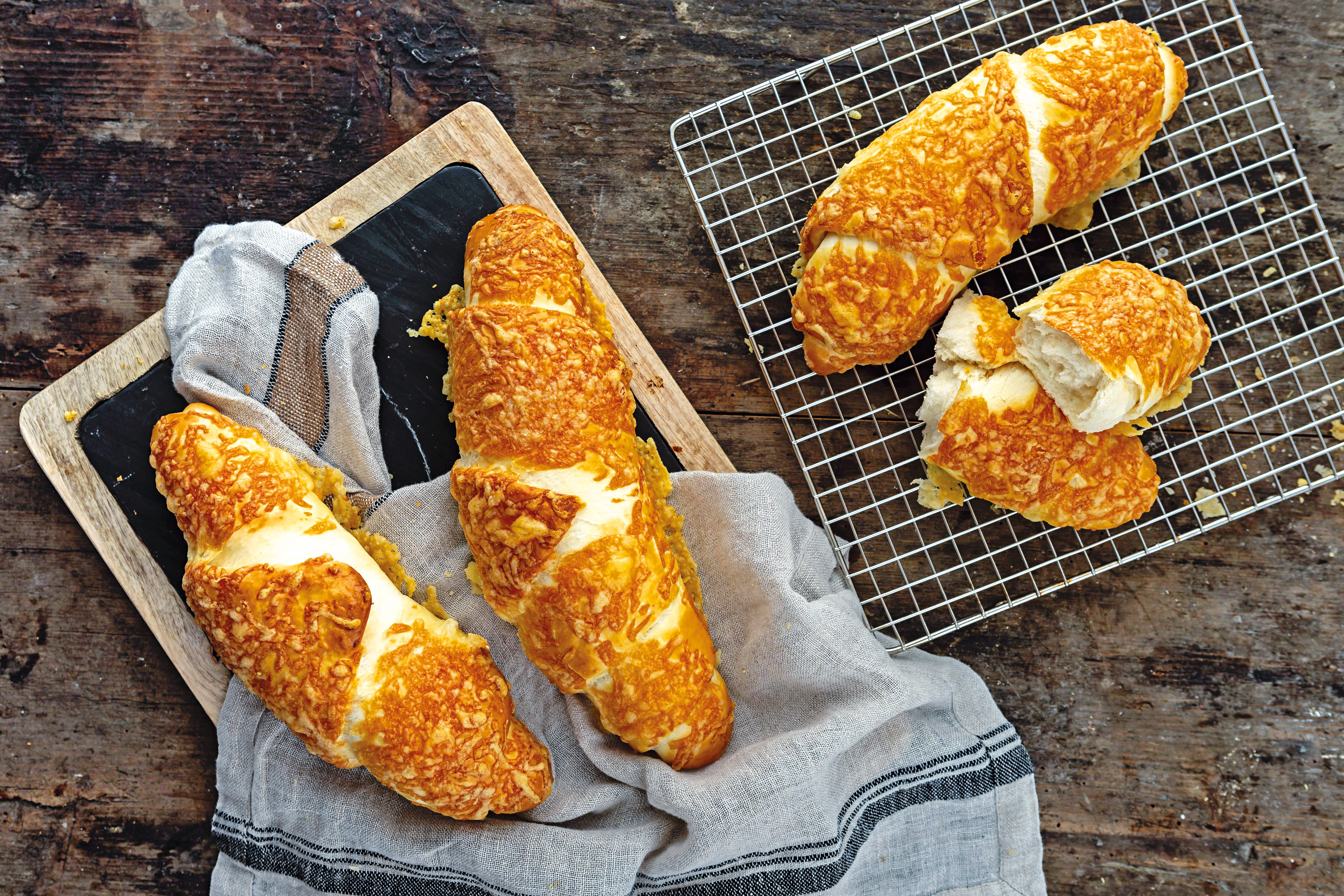 Stangerl mit verquirltem Ei bestreichen und mit Käse bestreuen. Jeweils 3 Stücke auf ein mit Backpapier belegtes Backblech legen und im Rohr nacheinander ca. 25 Minuten backen.