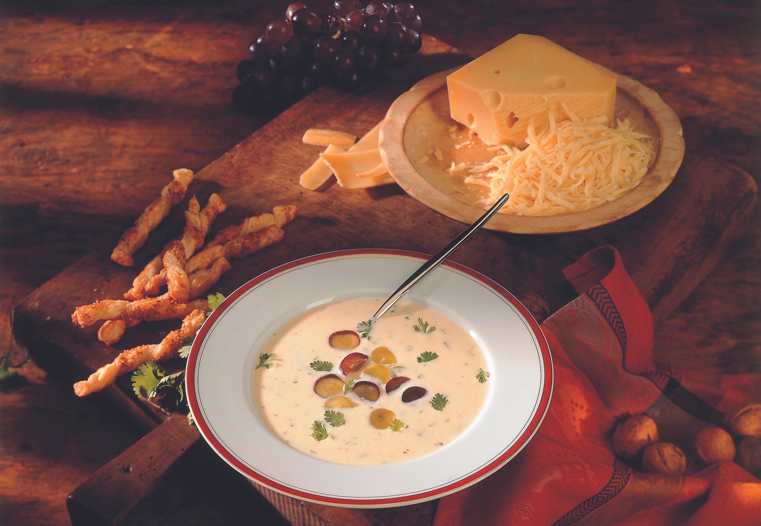 Zwei Drittel der Korianderblätter hacken, den Rest für die Garnitur beiseite legen. Koriander und Trauben in die Suppe rühren. Käsesuppe in vorgewärmten Tellern anrichten und mit den Korianderblättchen garniert servieren.