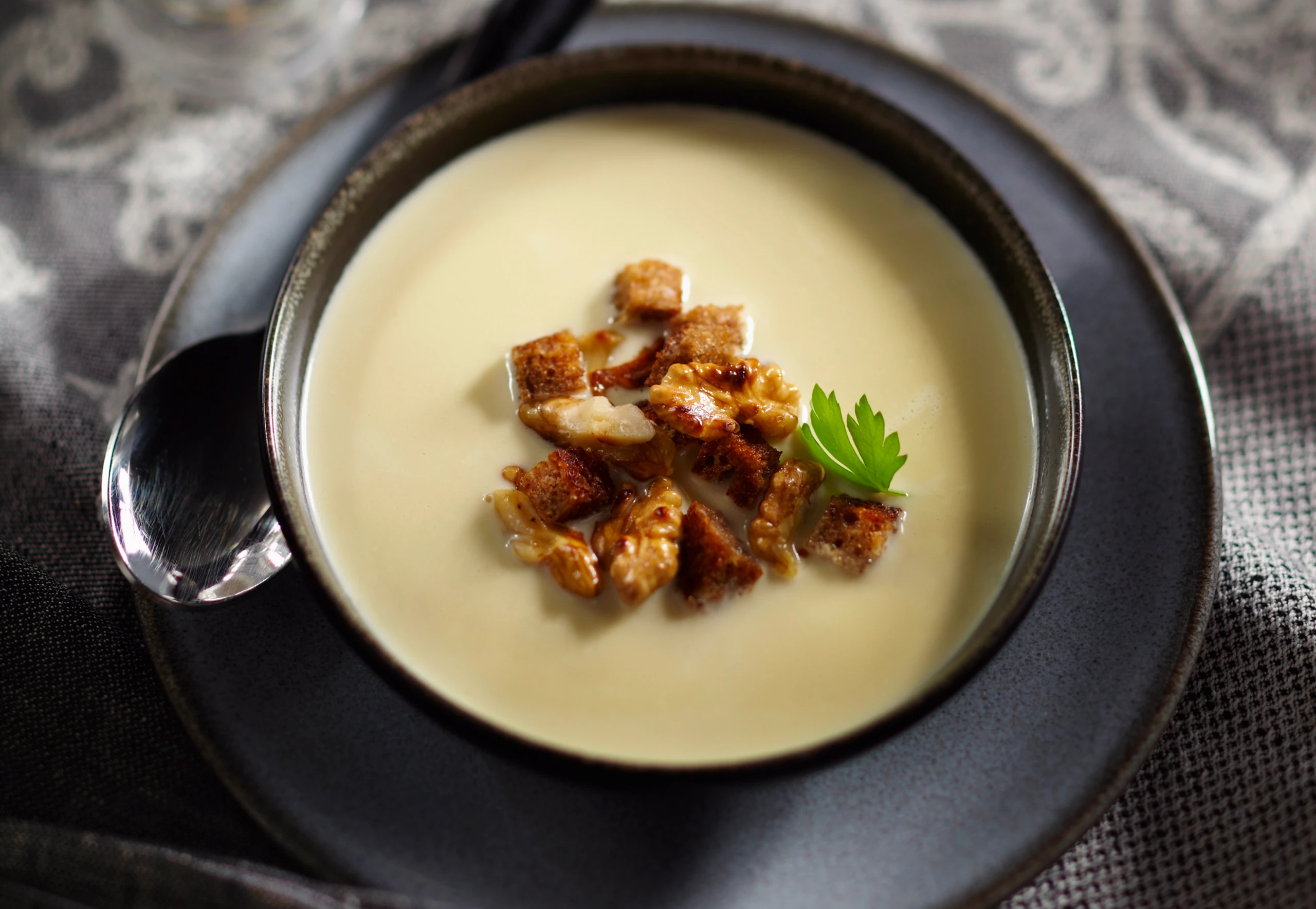Suppe mit Walnüssen und knusprigen Brotwürfeln anrichten.