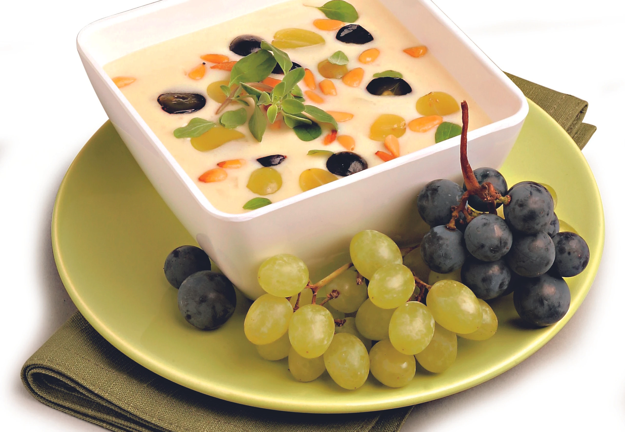Käse unter Rühren in der Suppe auflösen. Trauben einrühren, Suppe salzen, pfeffern, mit Pignoli und Majoran garniert servieren.