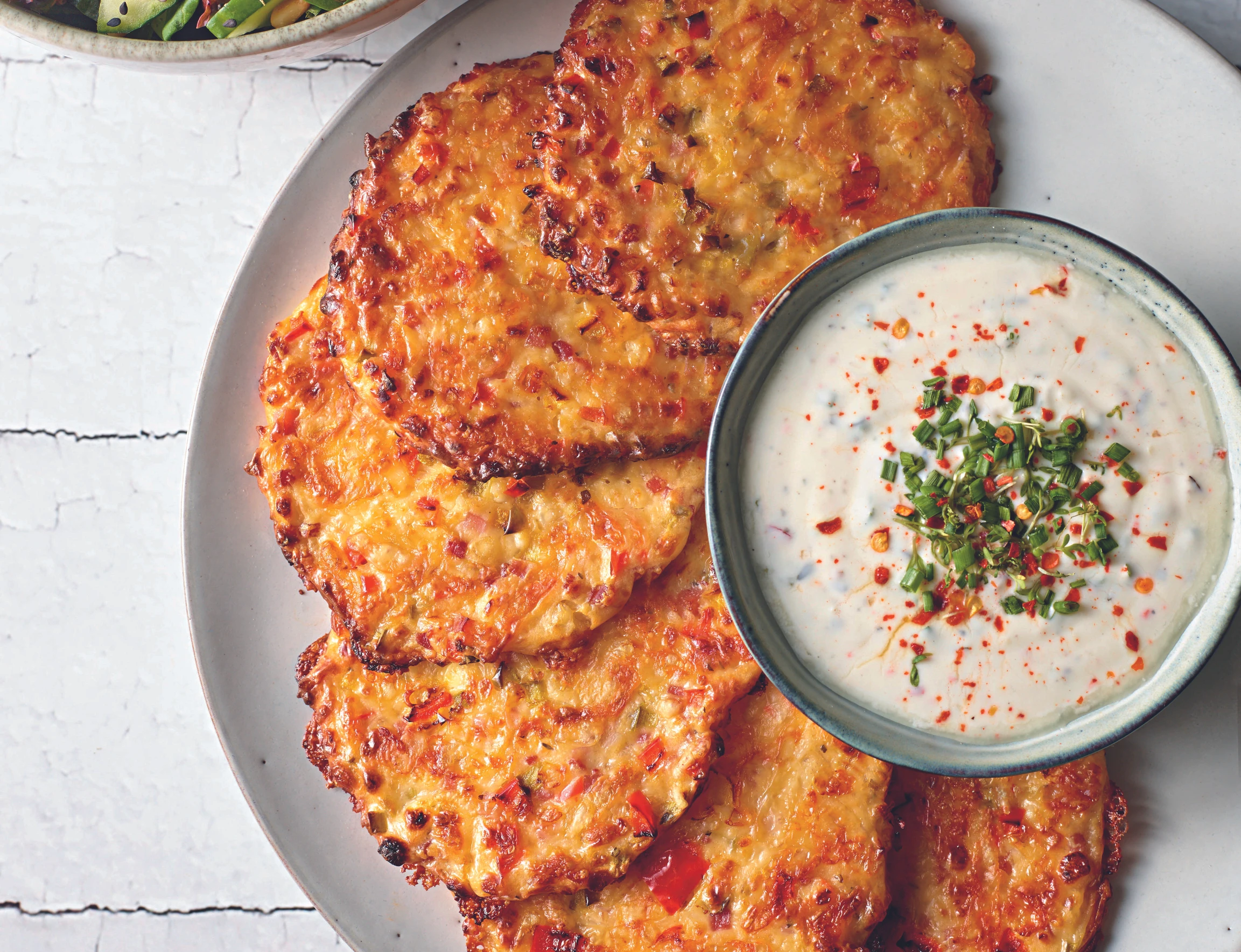 Käsetaler herausnehmen, kurz überkühlen lassen und mit Dip und Salat servieren.