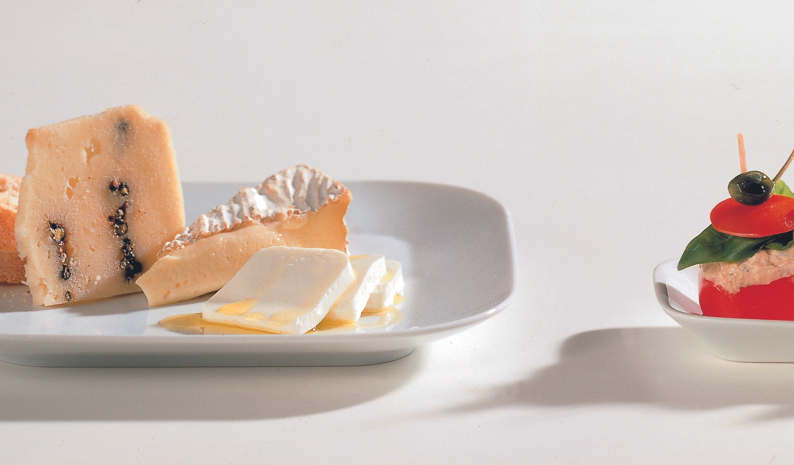 Käse in vier Portionen teilen und auf Tellern anrichten. Frischkäse vor dem Servieren mit Trüffelöl beträufeln. Käse mit Weißbrot servieren.