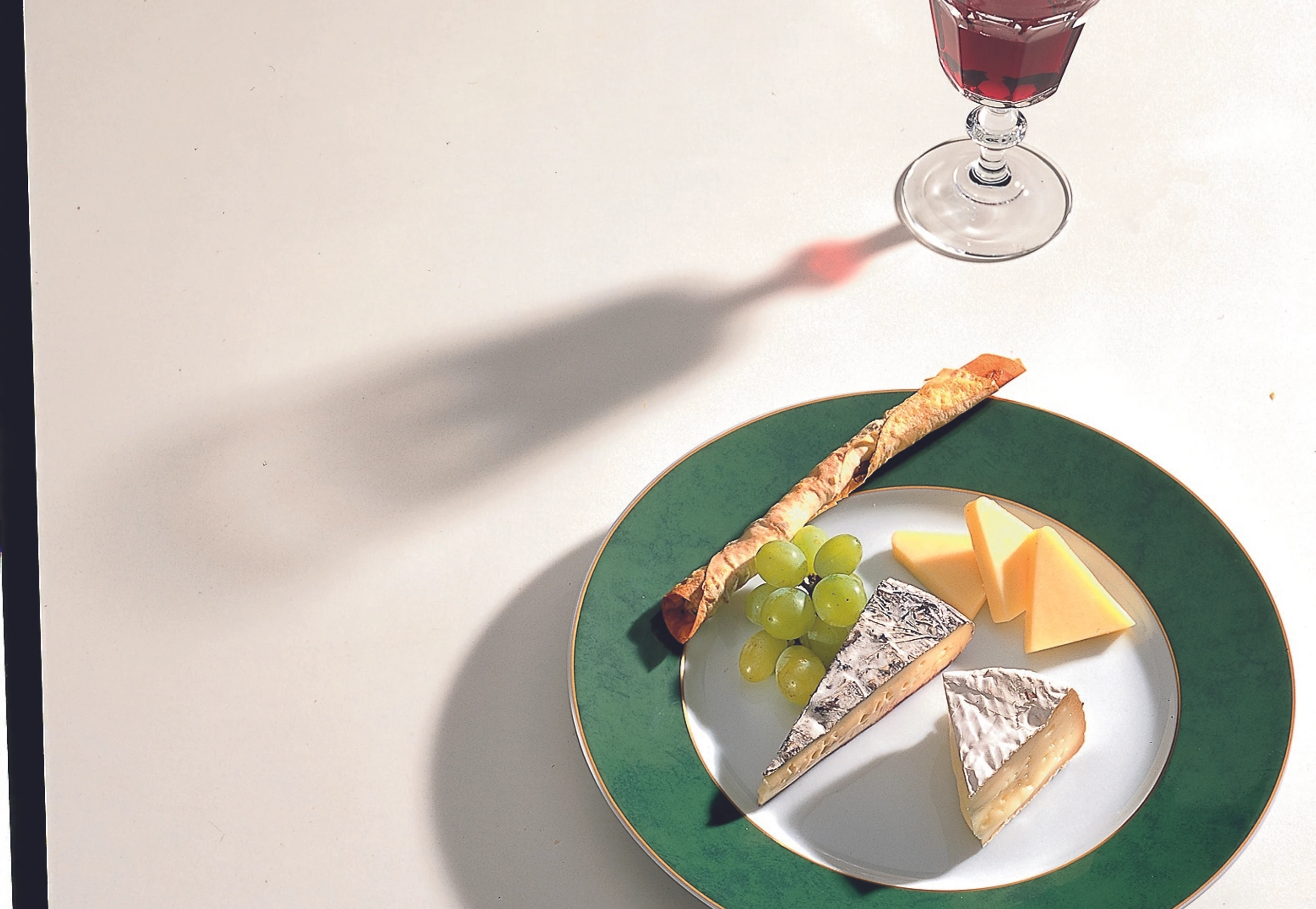 Käse in Stücke schneiden, auf Tellern anrichten und mit Trauben und Strudelröllchen garniert servieren.