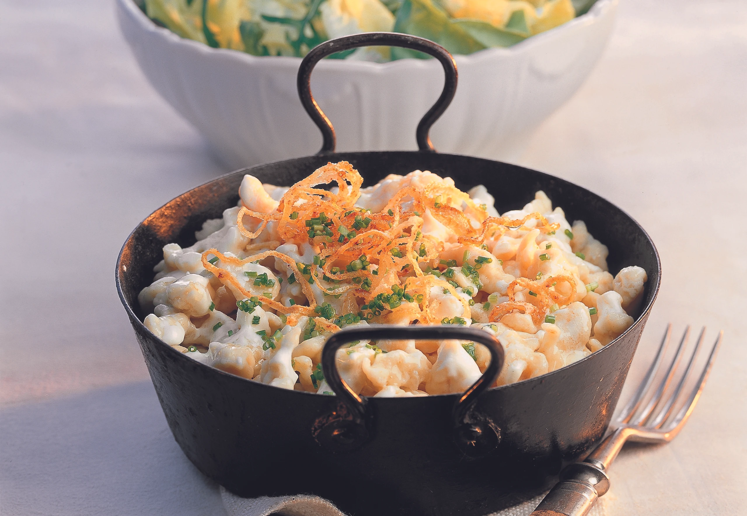 Spätzle herausheben, abtropfen lassen und lagenweise in eine Form oder Schüssel schichten, jede Lage mit Käse bestreuen – mit Spätzle abschließen. 1 Schöpfer Kochwasser darüber gießen, Röstzwiebel darüber streuen und mit Butter übergießen. Spätzle pfeffern und mit Schnittlauch bestreuen.