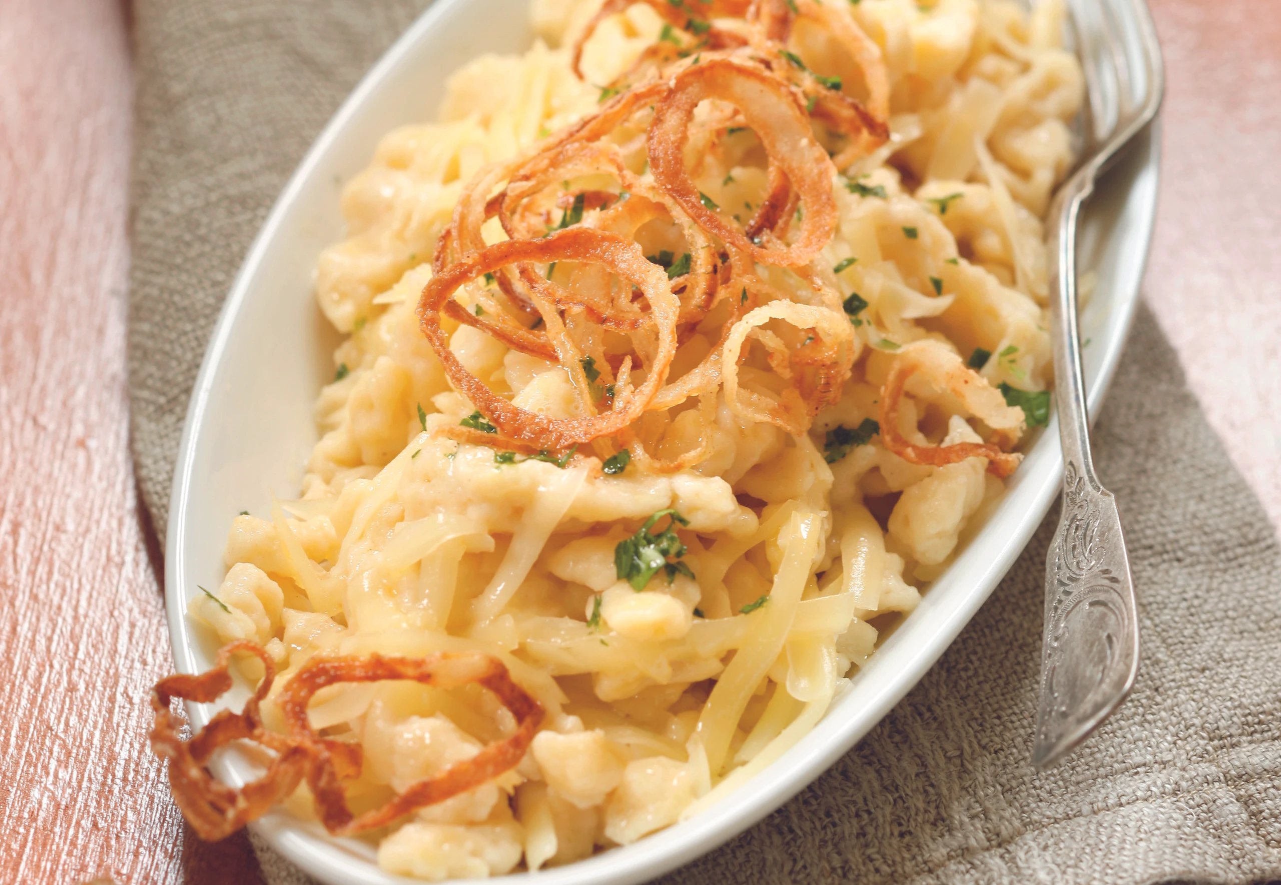 Spätzle lagenweise in eine Form schichten, jede Lage mit Käse bestreuen – mit Spätzle abschließen. 1 Schöpfer Kochwasser darübergießen, Röstzwiebel darüberstreuen und mit Butter übergießen. Spätzle mit Petersilie bestreut servieren.