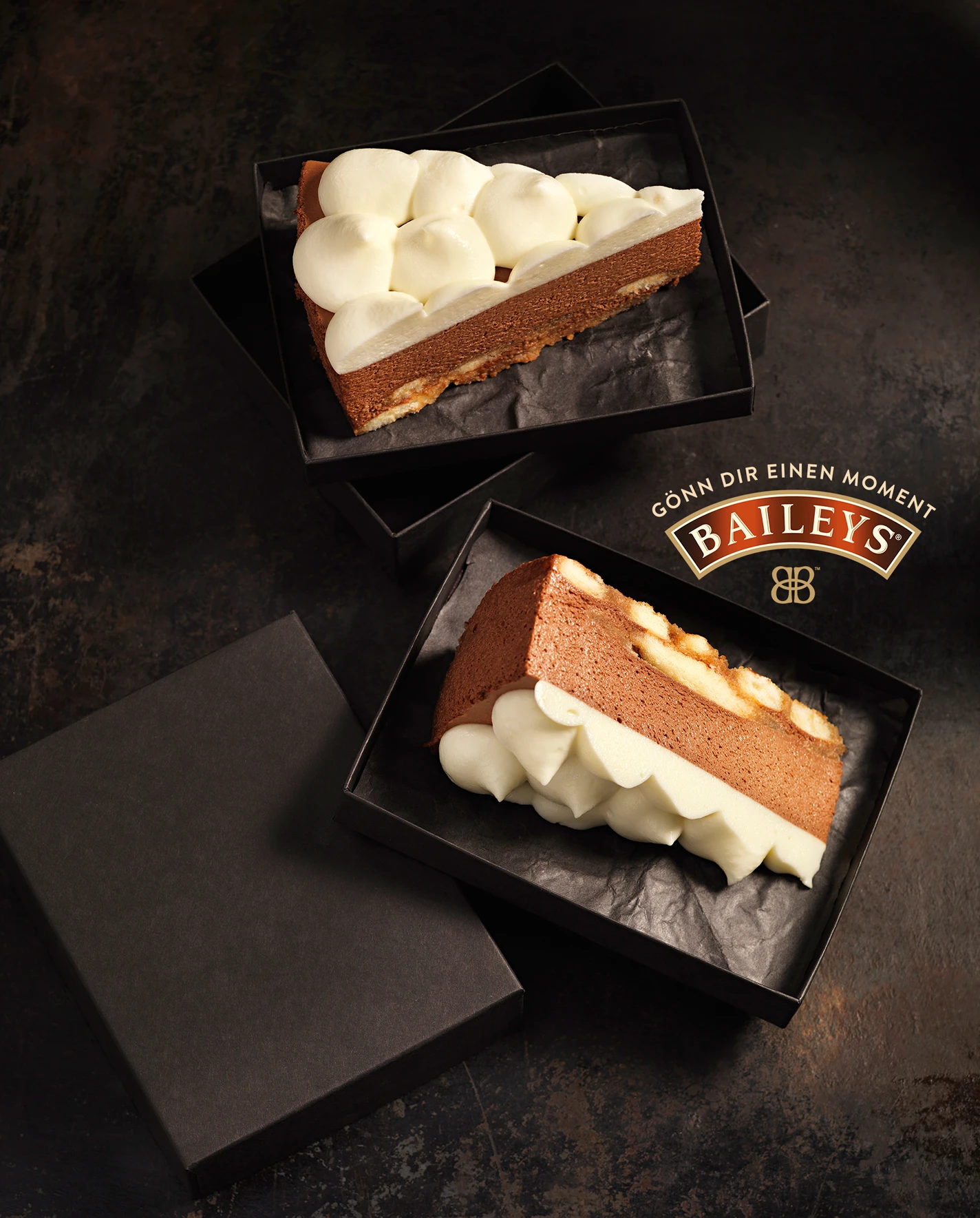 - Springform (Ø 26 cm) vorbereiten. Für die Creme Gelatine in kaltem Wasser einweichen. Eier, Dotter, Kristallzucker und Löskaffee über Dampf schaumig schlagen. Gelatine gut ausdrücken und unterrühren. Rum, Baileys und Kuvertüre zugeben, glatt rühren, Masse leicht überkühlen lassen. Obers schlagen und unterheben.
