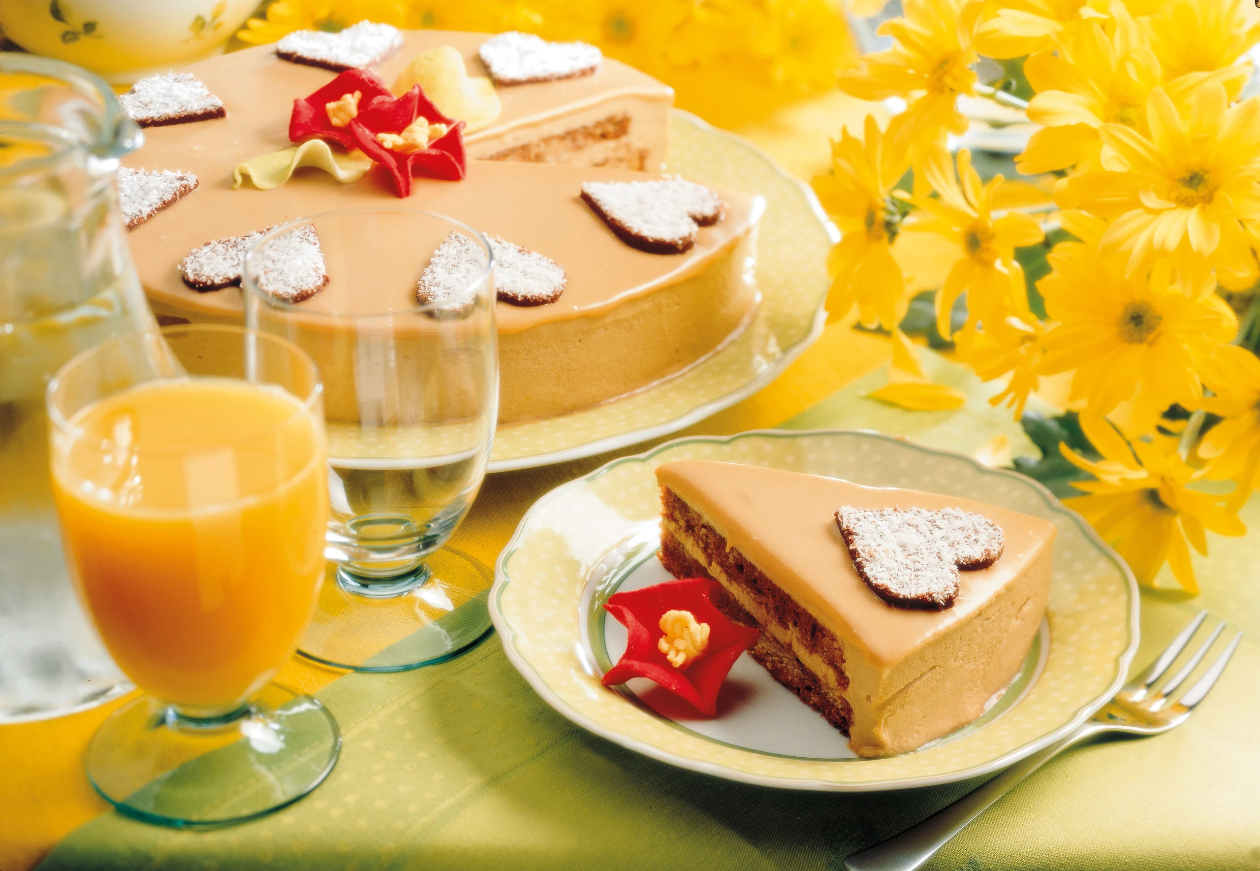 Backblech mit Backpapier belegen. Bitterschokolade in kleine Stücke schneiden, über Wasserdampf schmelzen und auf das Papier gießen. Schokolade ca. 3 mm hoch glatt verstreichen, mit Kokosette bestreuen und fest werden lassen. Aus der Schokolade Herzen ausstechen, mit einer Palette vom Blech heben und die Torte damit verzieren.