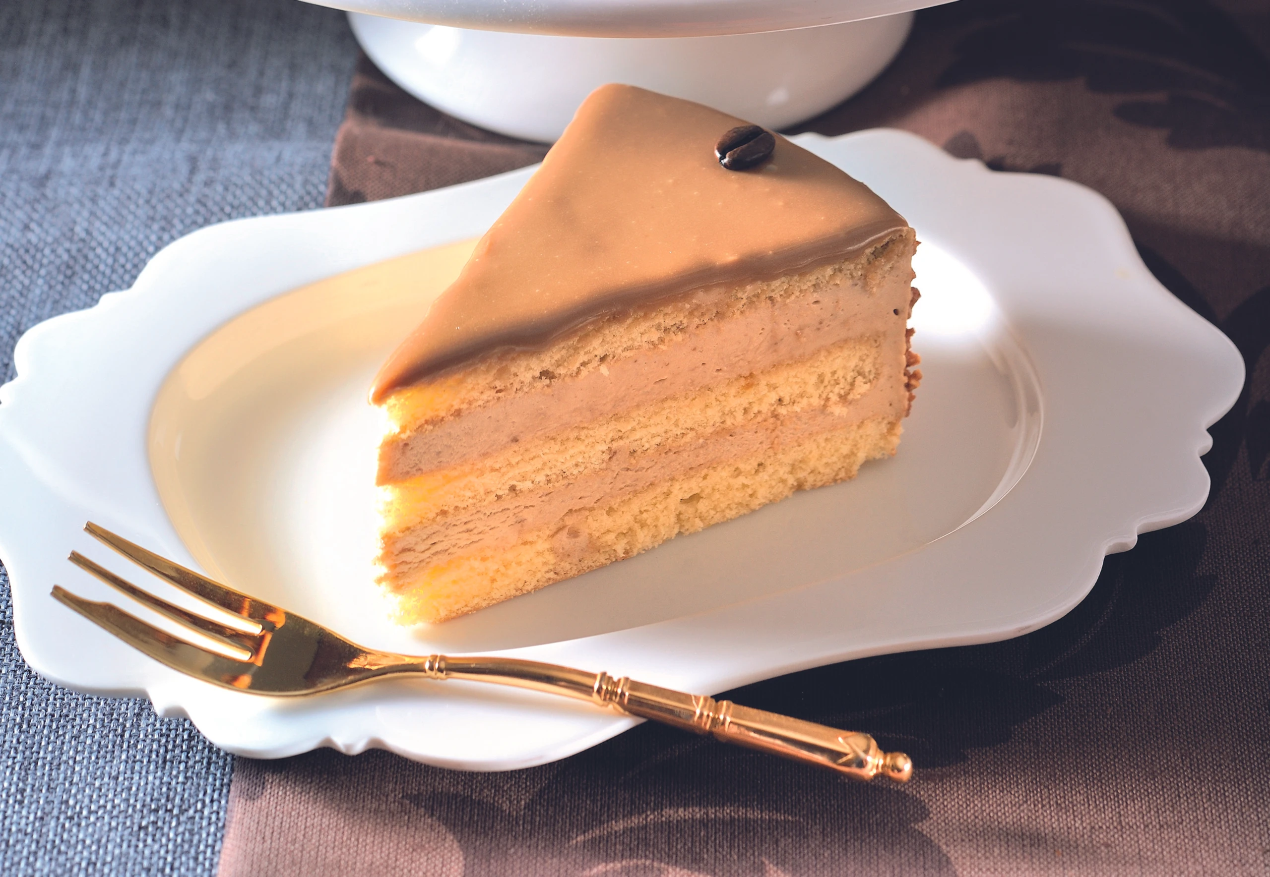 Torte aus dem Rohr nehmen, mit Kristall-zucker dünn bestreuen, mit Backpapier belegen, umdrehen und auskühlen lassen. Für die Creme Gelatine in kaltem Wasser einweichen. Milch mit 1 Prise Salz und Kaffee aufkochen. Dotter und Zucker schaumig rühren, Milchkaffee zügig einrühren. Masse in das Kochgeschirr geben und bei schwacher Hitze cremig rühren. Gelatine ausdrücken und in der Creme auflösen. Creme für 30 Minuten kühl stellen. Obers cremig schlagen, ein Drittel davon mit der Creme verrühren, restliches unterheben.