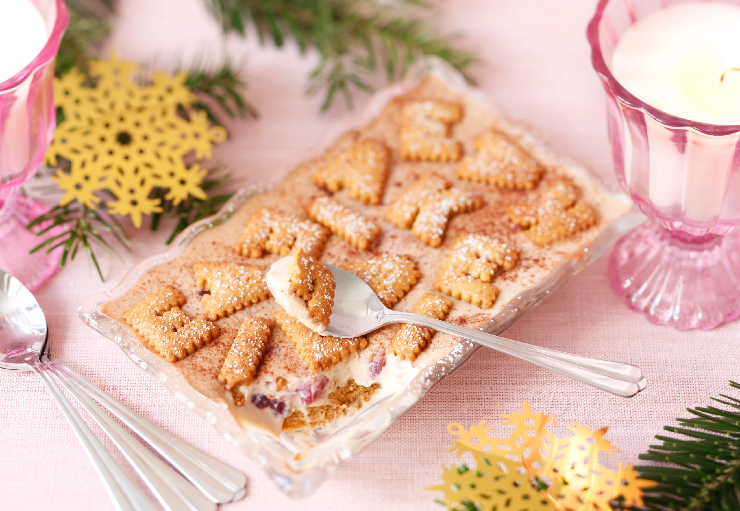 Tiramisu vor dem Servieren mit Kakao und Staubzucker bestreuen.