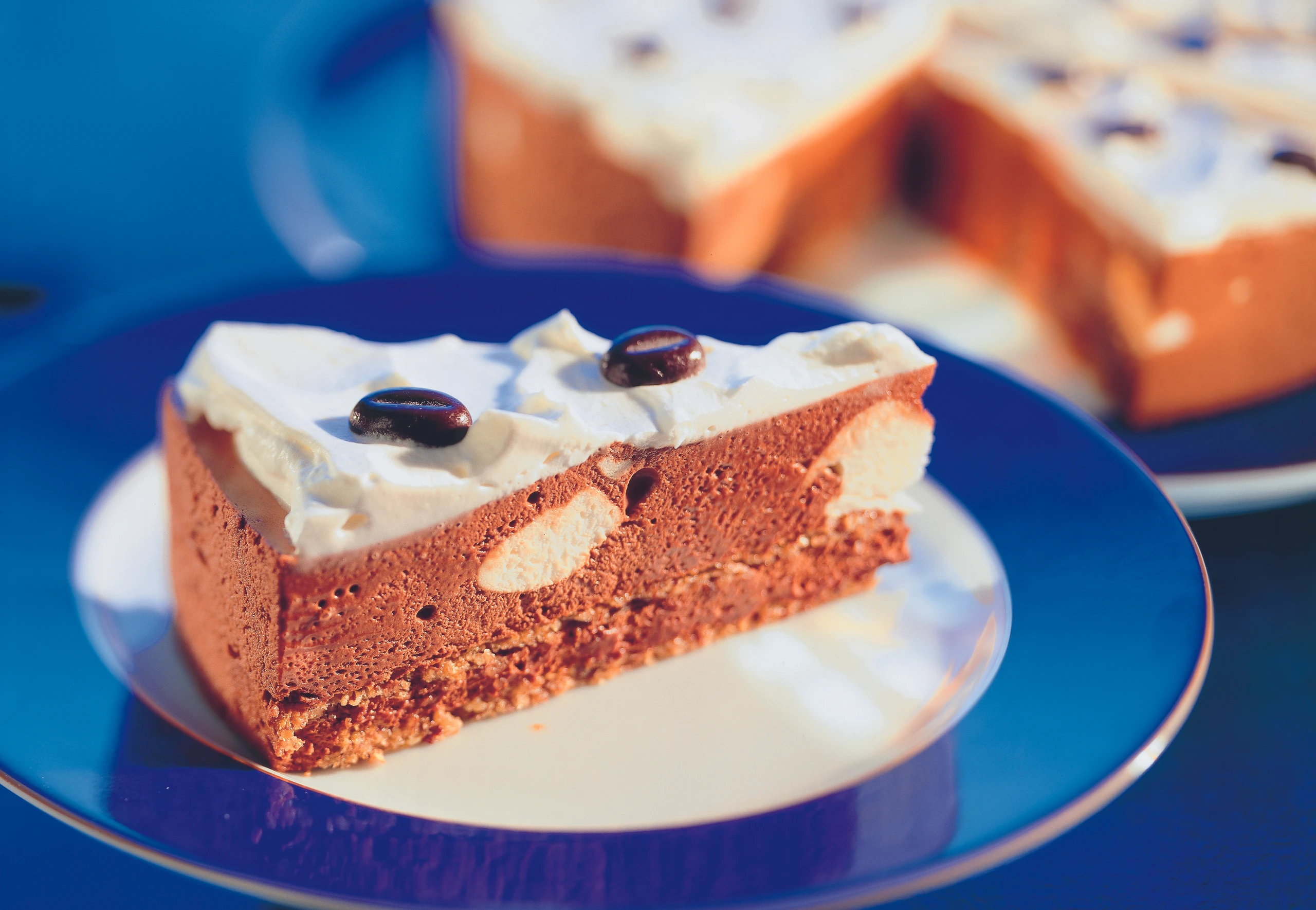 Einen Baiserboden in eine Springform (Ø 24 cm) legen, mit ca. 3 EL Creme bestreichen. Zweiten Boden darauflegen. Aus dem Obers für die Einlage Nockerln ausstechen und auf dem Tortenboden verteilen. Kaffee-Schokolade-Creme eingießen und gleichmäßig verstreichen.