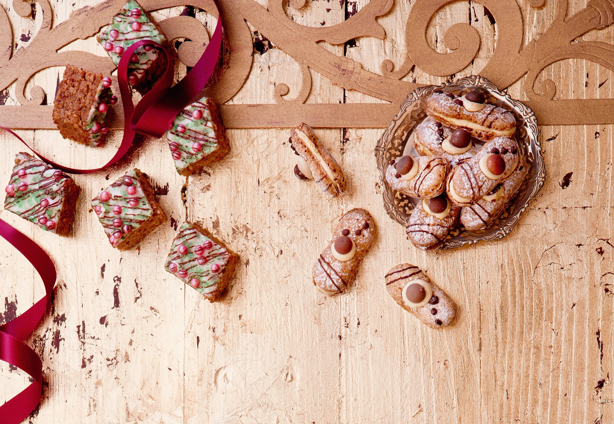 Für die Fülle ein Viertel von der Milch mit Puddingpulver und Dotter verrühren. Übrige Milch, Kristallzucker, Vanillezucker und Kaffee aufkochen, Pudding einrühren und cremig köcheln. Mischung umfüllen und abkühlen lassen. Butter nach und nach zugeben, Masse cremig rühren. 2 EL von der Creme reservieren. Je 2 Kekse mit der Fülle zusammensetzen, mit Schokolade, Creme und Schokobohnen garnieren.