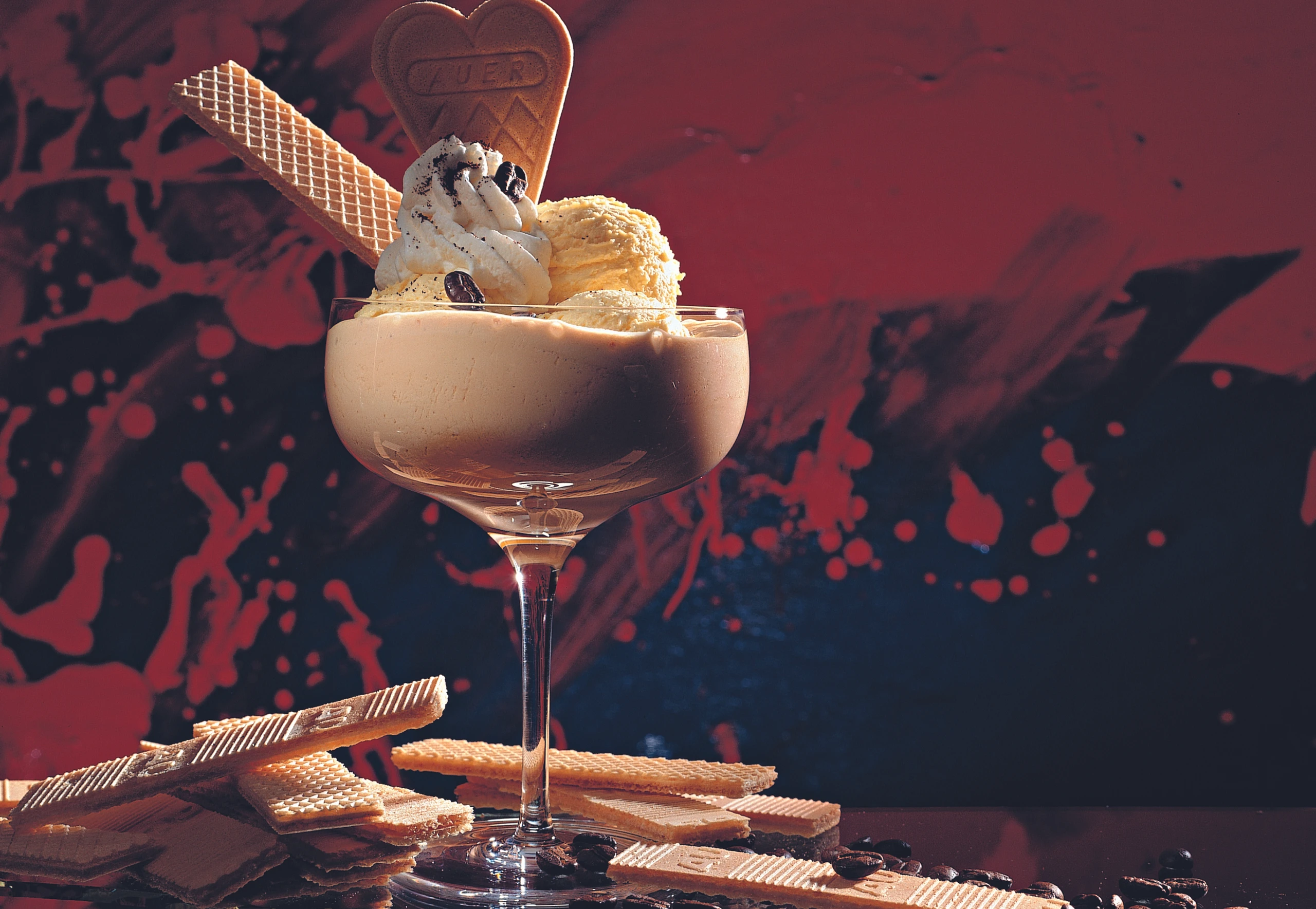 Vanilleeis portionieren und in den Gläsern anrichten. Obers aufspritzen, mit gemahlenem Kaffee bestreuen und mit Kaffeebohnen und Waffeln garnieren.
