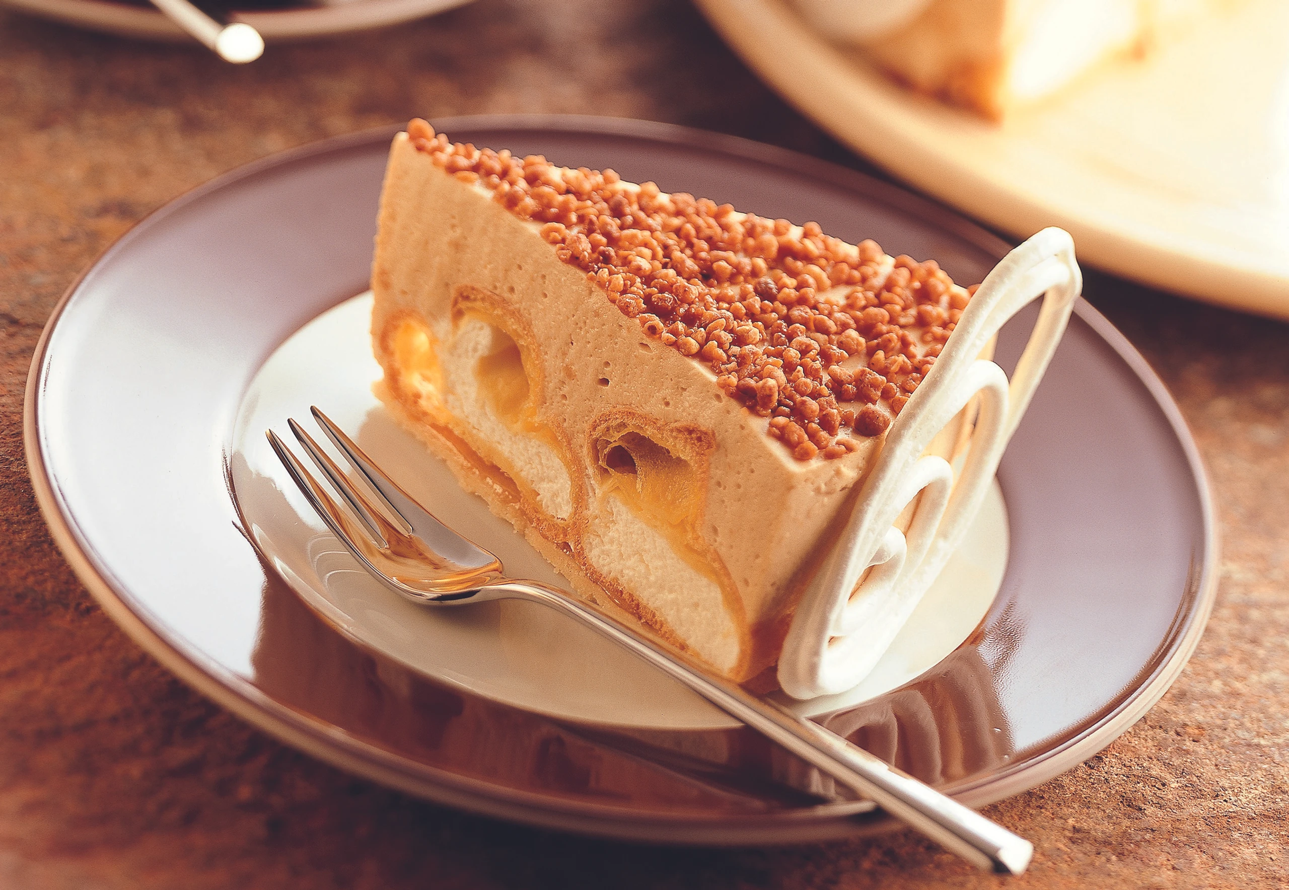 Torte aus dem Kühlschrank nehmen und die Folie entfernen. Tortenoberfläche mit Krokant bestreuen, Rand mit den Baiser-Ornamenten (siehe Rezept) dekorieren.
