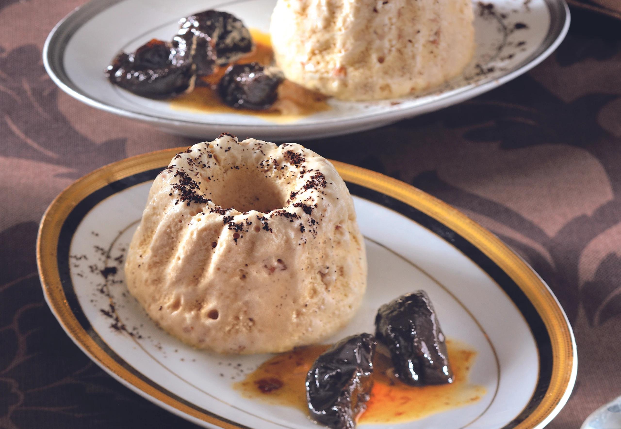 Parfaits aus den Förmchen stürzen, mit den Pflaumen anrichten und eventuell mit gemahlenem Kaffee bestreuen.