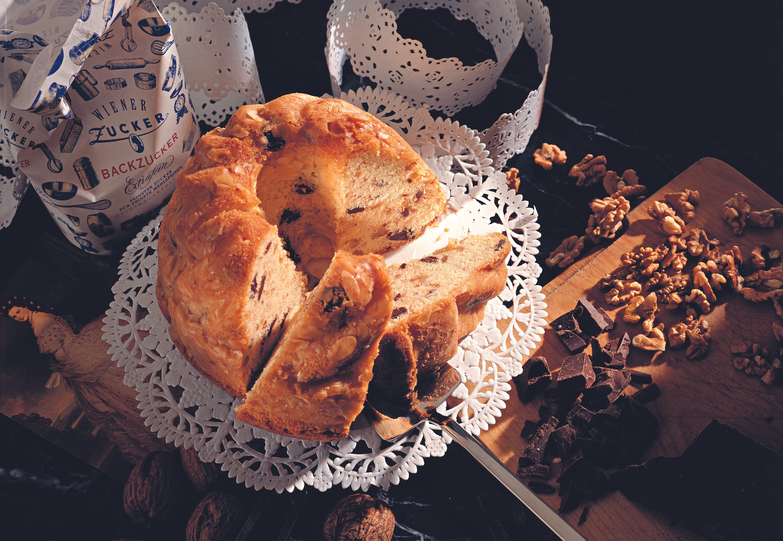 Gugelhupf aus dem Rohr nehmen, etwa 10 Minuten in der Form rasten lassen, auf ein mit Kristallzucker bestreutes Stück Backpapier stürzen und auskühlen lassen.
