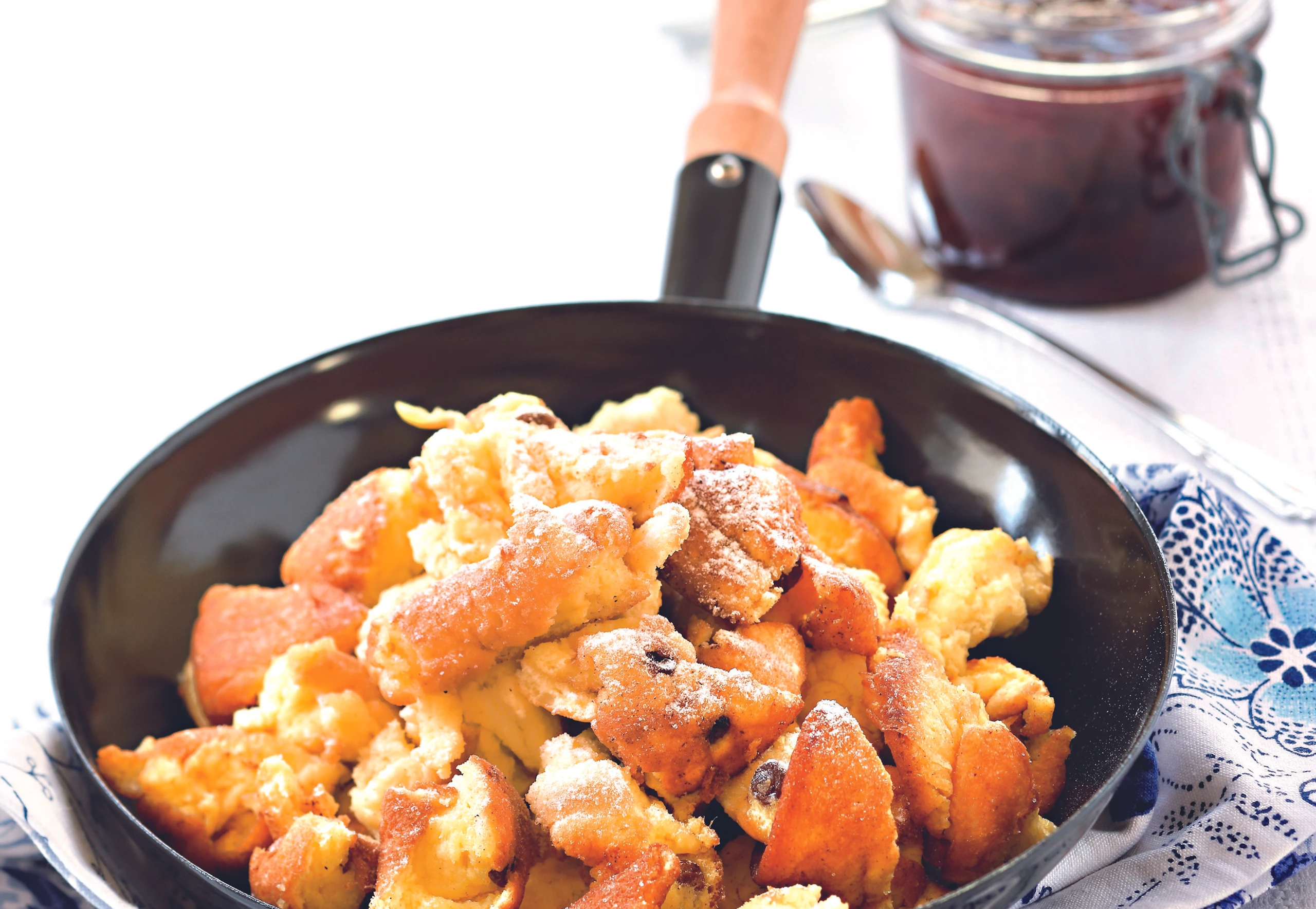 Schmarren mit zwei Gabeln in kleine Stücke zerteilen und zur Seite schieben. Auf der freien Pfannenfläche Kristallzucker karamellisieren lassen, mit dem Schmarren vermischen. Schmarren mit Staubzucker bestreuen und mit Zwetschkenröster servieren.