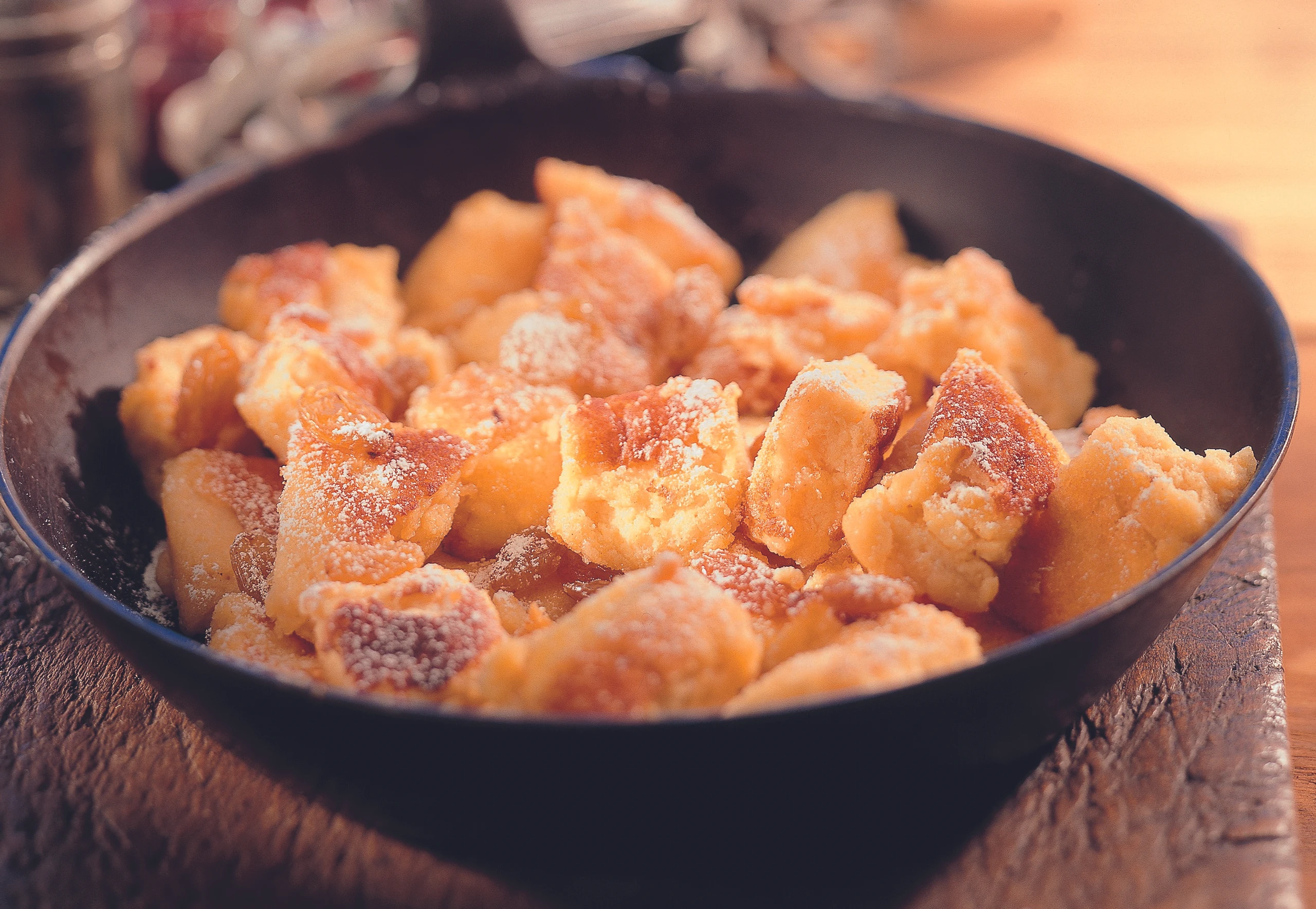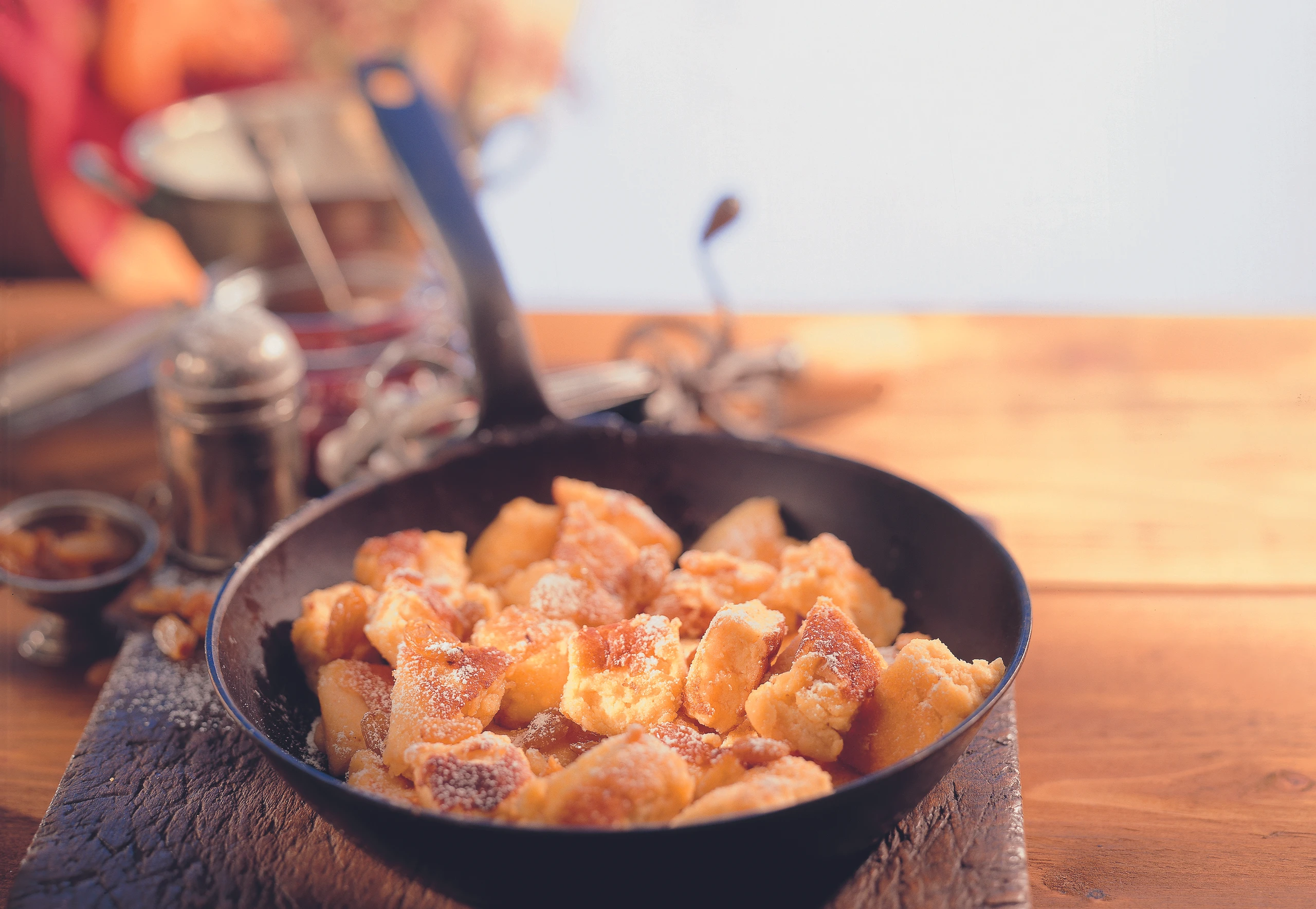 In einer Pfanne (mit hitzebeständigem Griff! Ø 24 cm) Butterschmalz erhitzen. Teig einfüllen, gleichmäßig verteilen, mit Rosinen bestreuen und bei mäßiger Hitze ca. 30 Sekunden anbacken. Schmarrn ins Rohr (mittlere Schiene / Gitterrost) stellen und 8-10 Minuten backen.